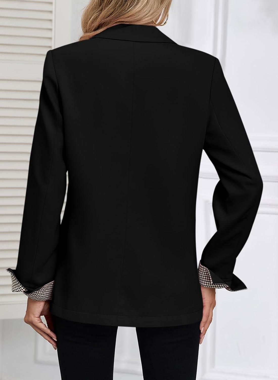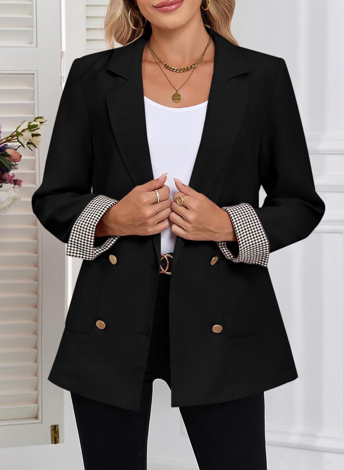 Happy Sailed Womens Blazers Plaid Cuff Double Breasted Open Front Business Casual Office Suit Jackets Work Outfits(Black)