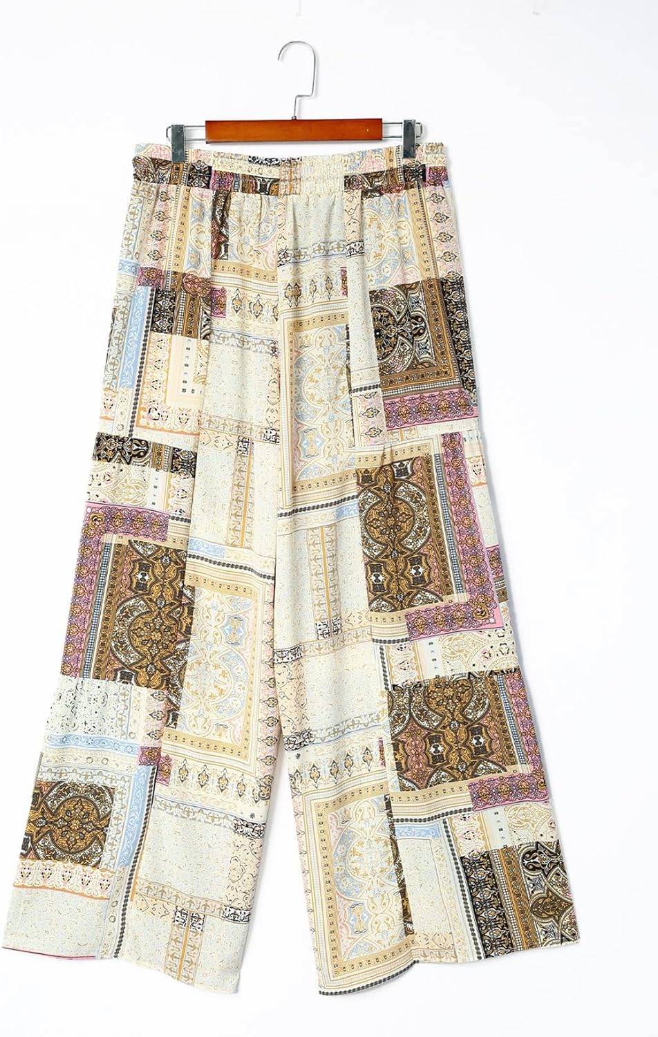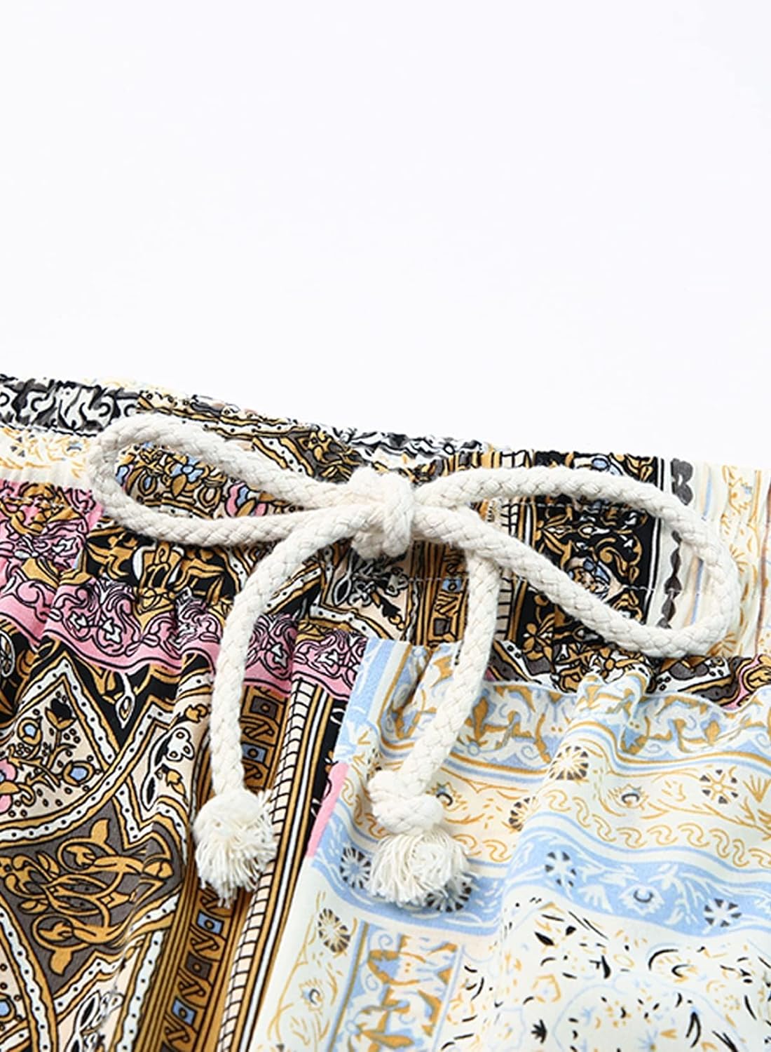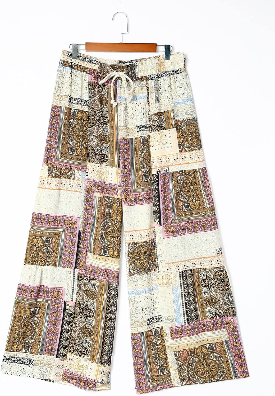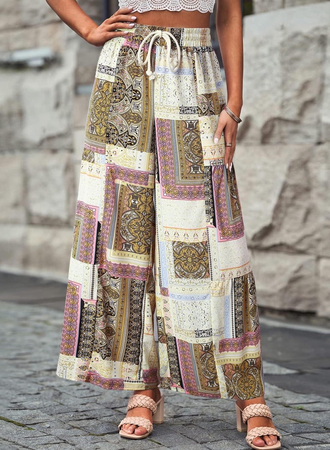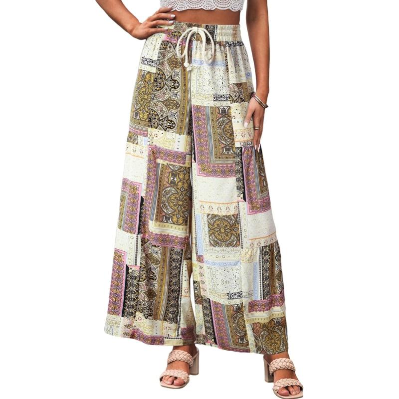 Happy Sailed Womens Boho Print Palazzo Pants Elastic High Waist Drawstring Wide Leg Hippie Flowy Pants