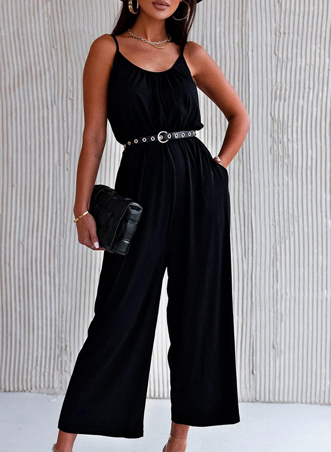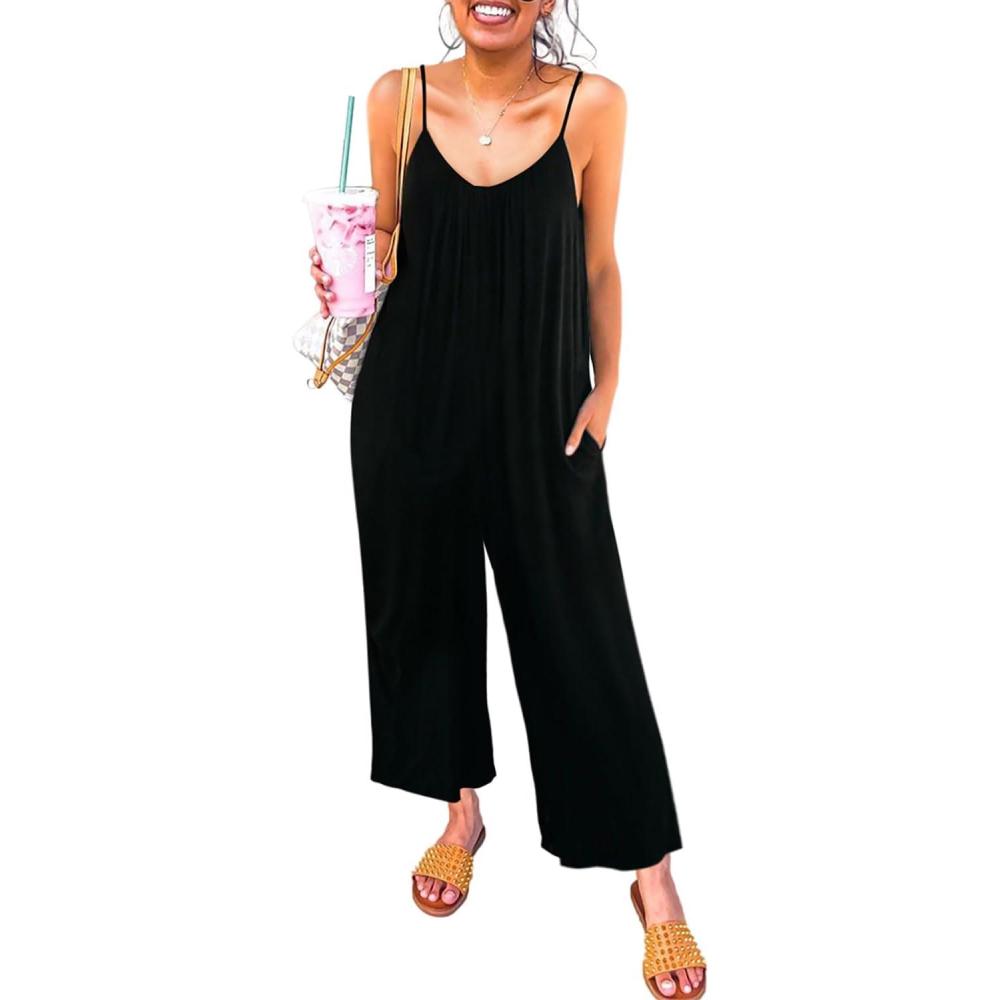 Happy Sailed Womens Casual Jumpsuits Loose Overalls Summer Sleeveless Stretchy Wide Leg Long Pants Romper with Pockets(A Solid Black)