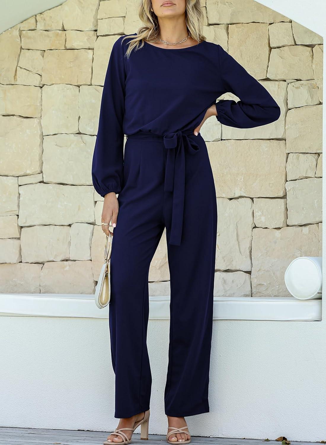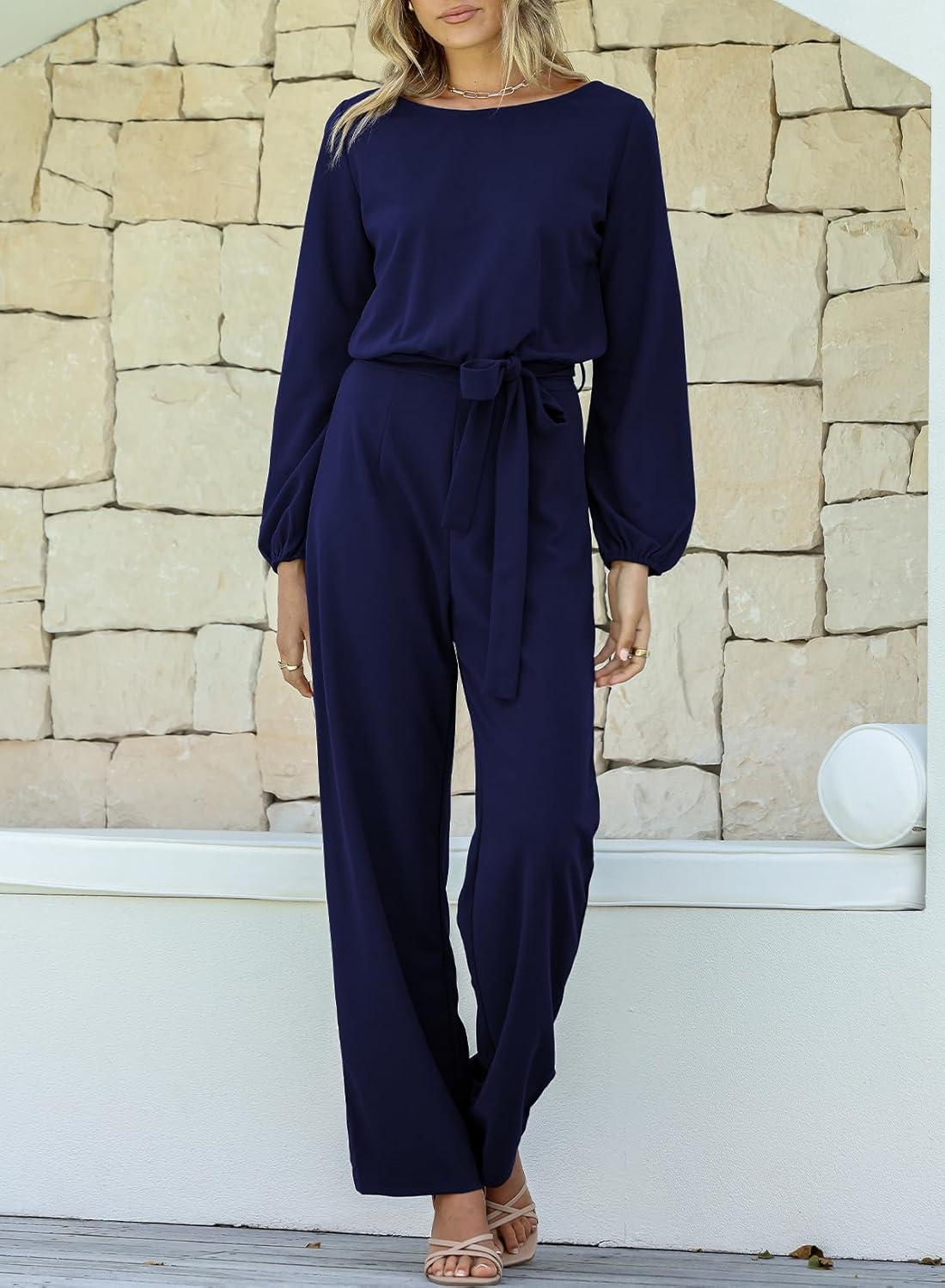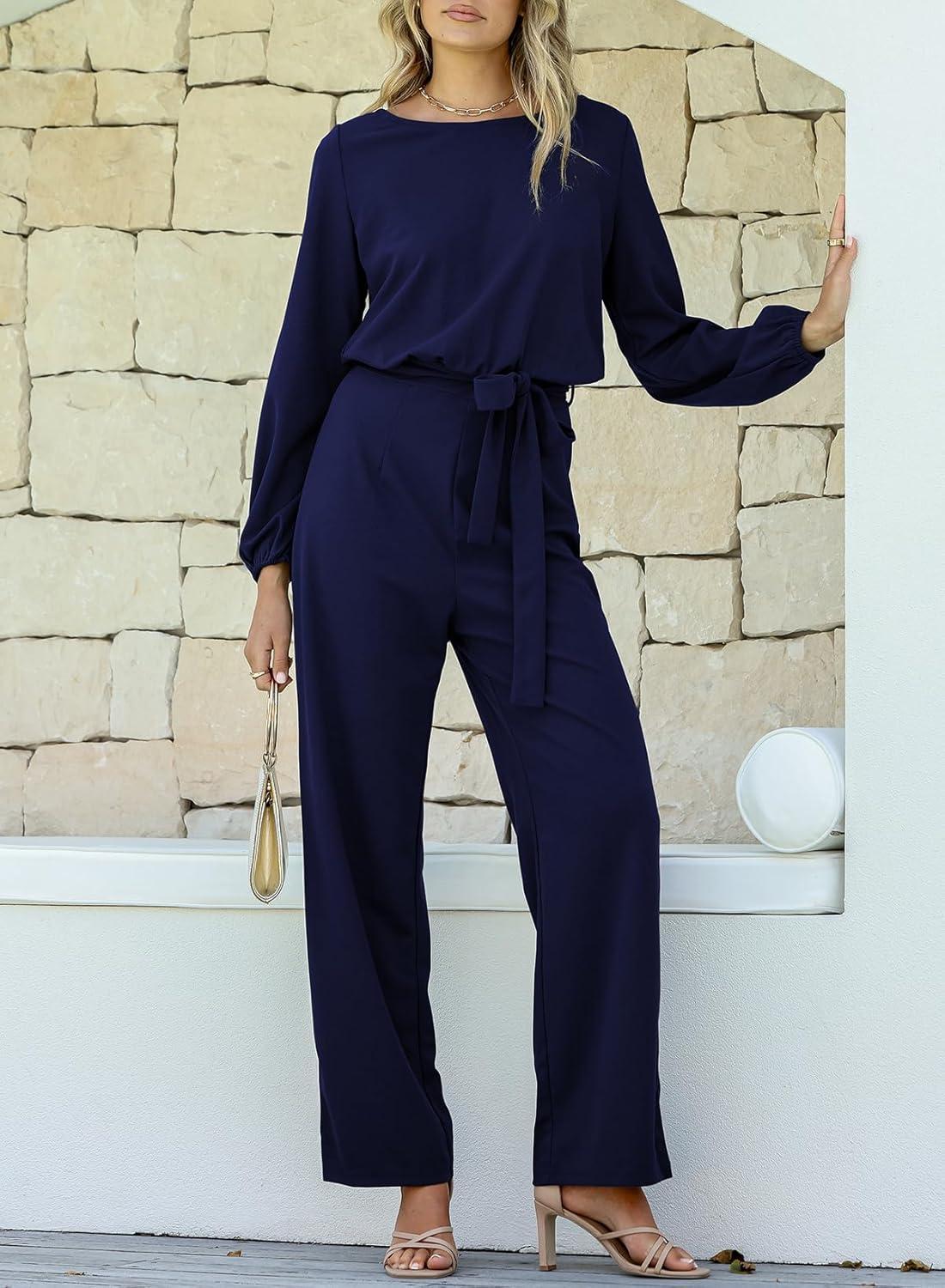 Happy Sailed Womens Loose Short Sleeve Belted Wide Leg Pant Romper Jumpsuit Business Casual One Piece Outfits(Blue)