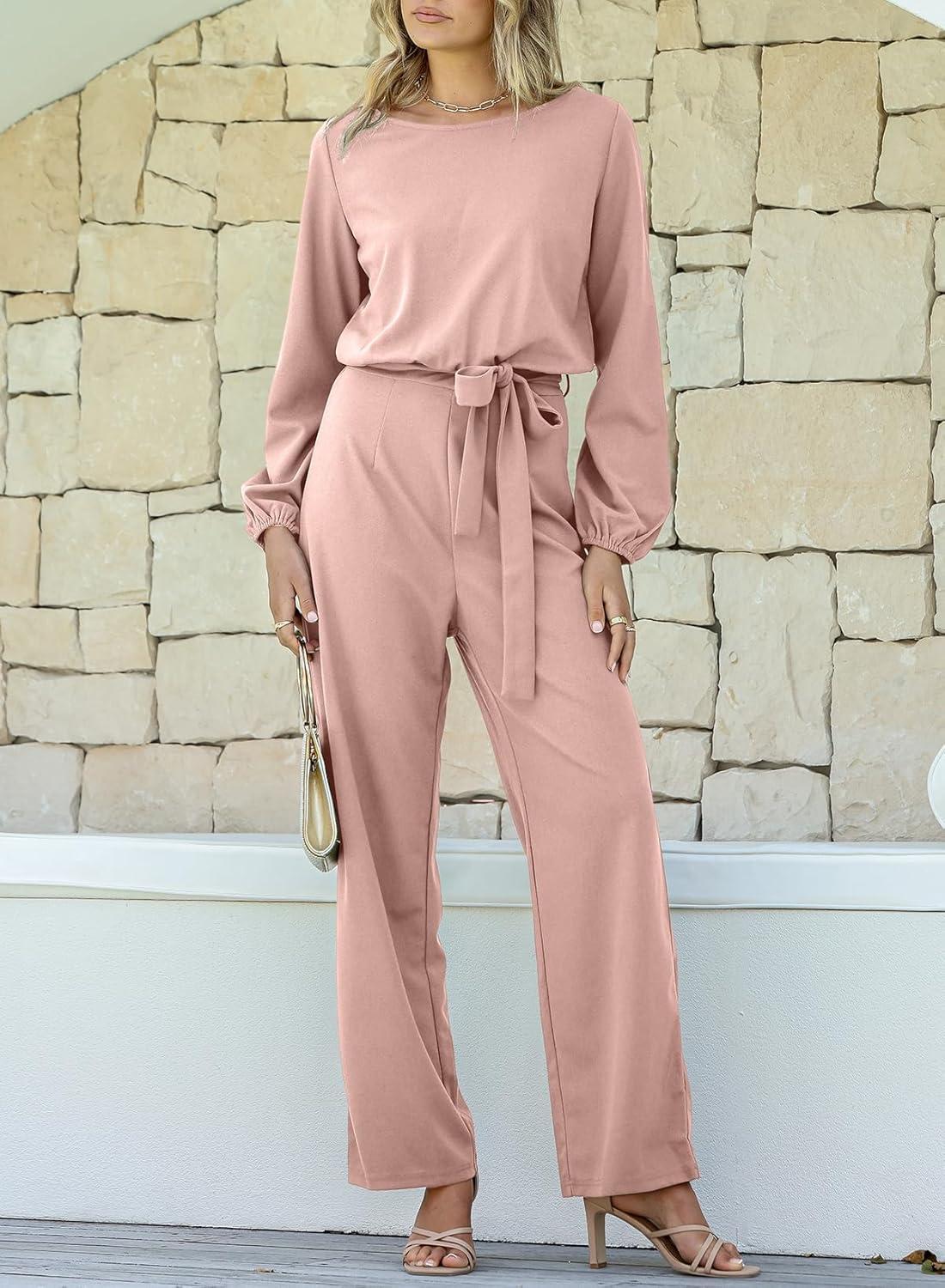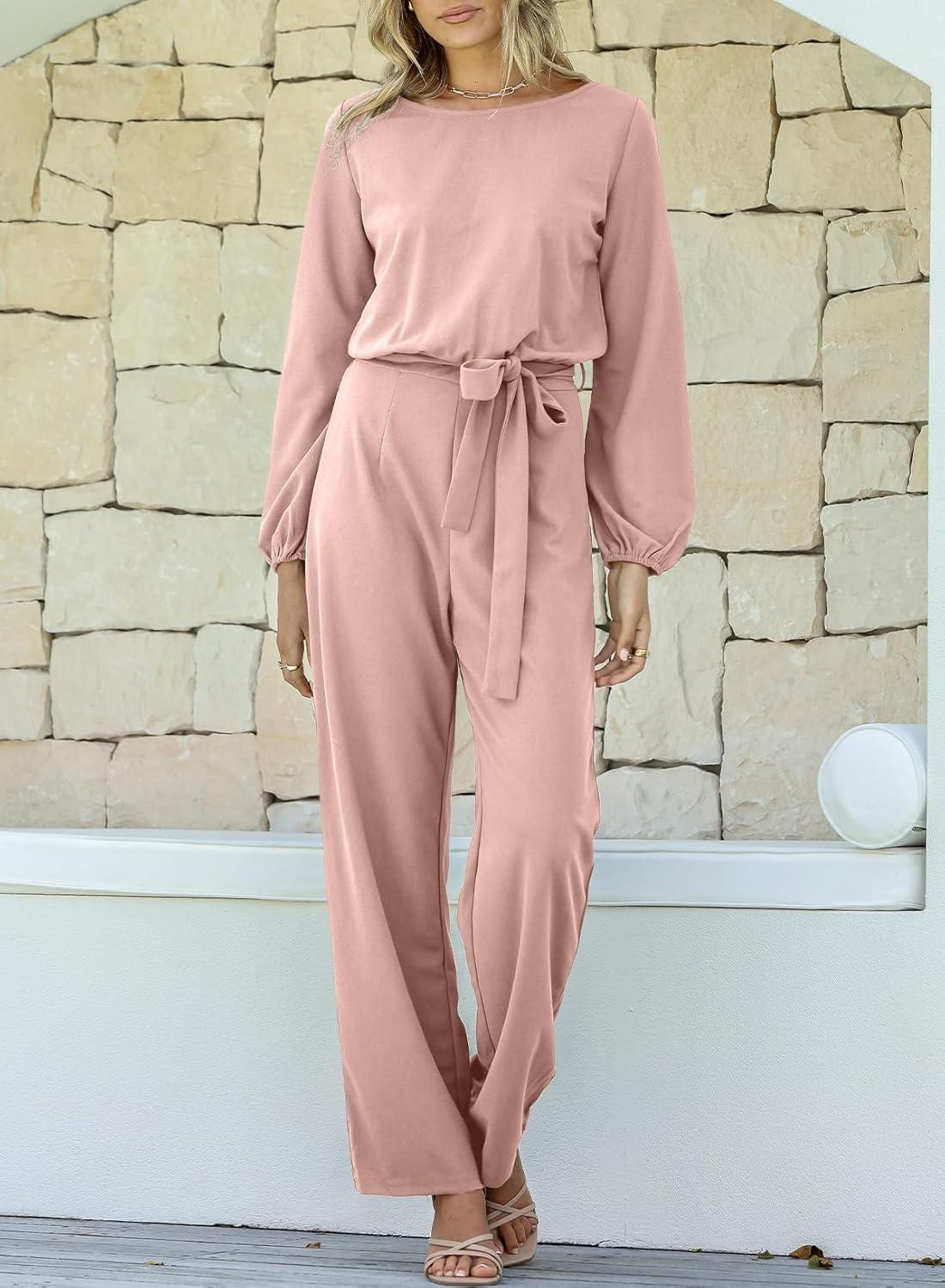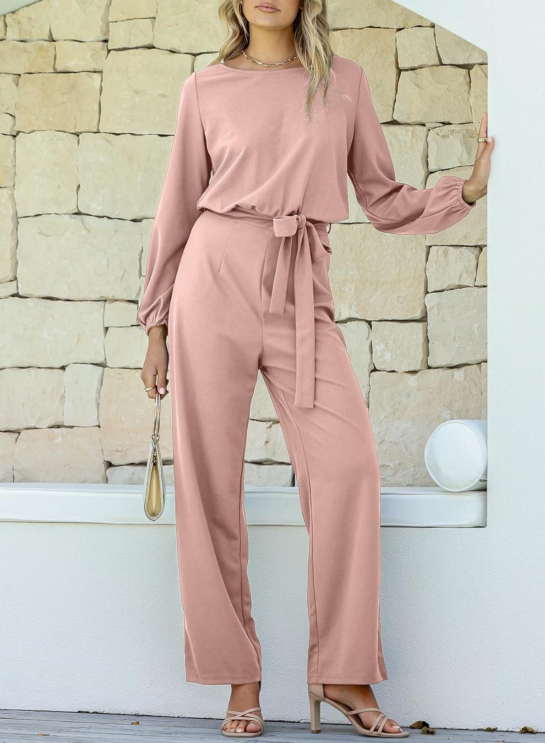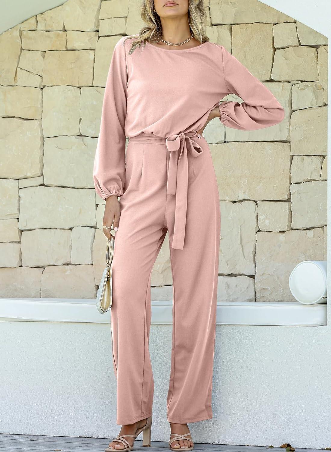 Happy Sailed Womens Loose Short Sleeve Belted Wide Leg Pant Romper Jumpsuit Business Casual One Piece Outfits(Pink)