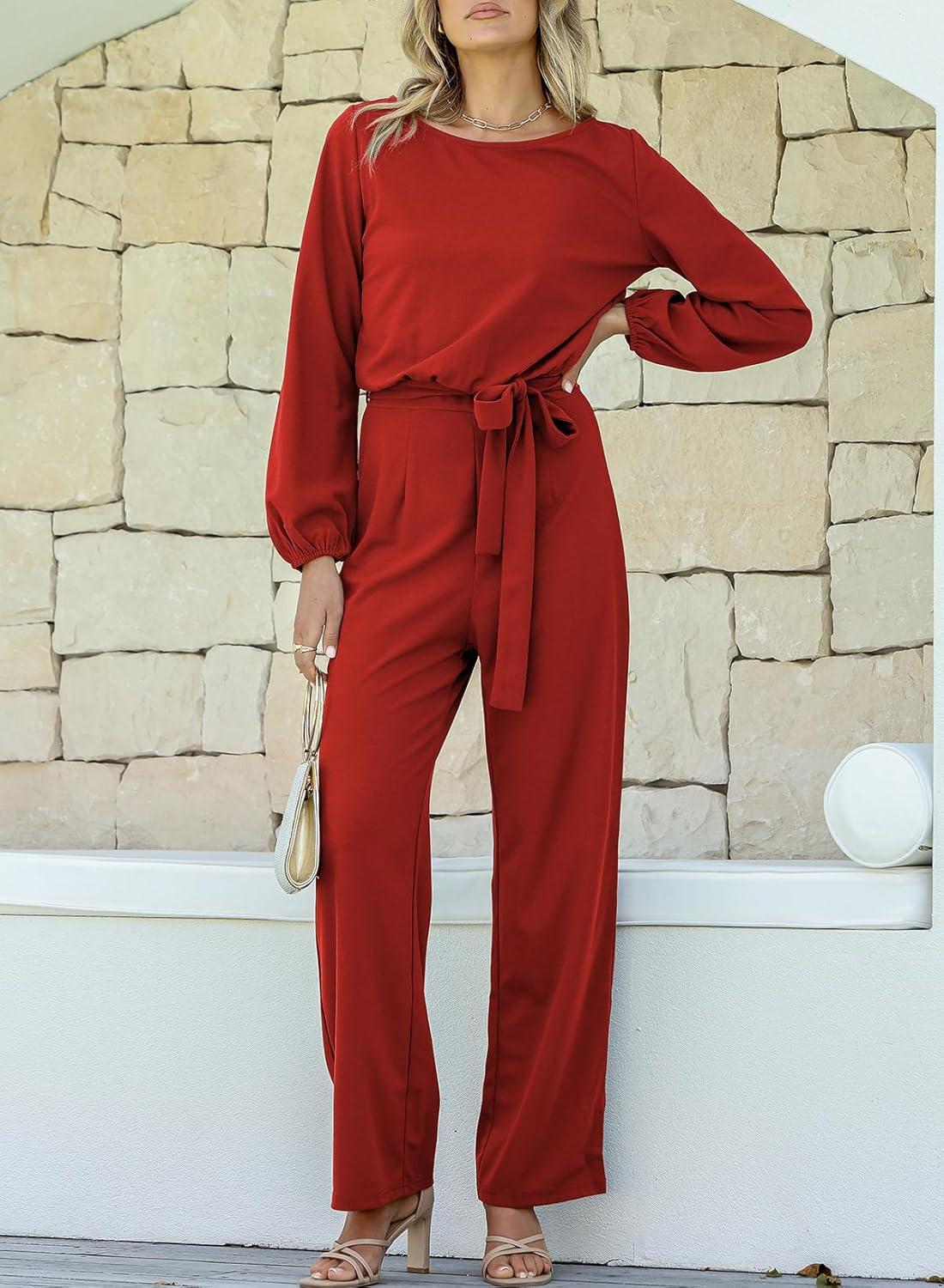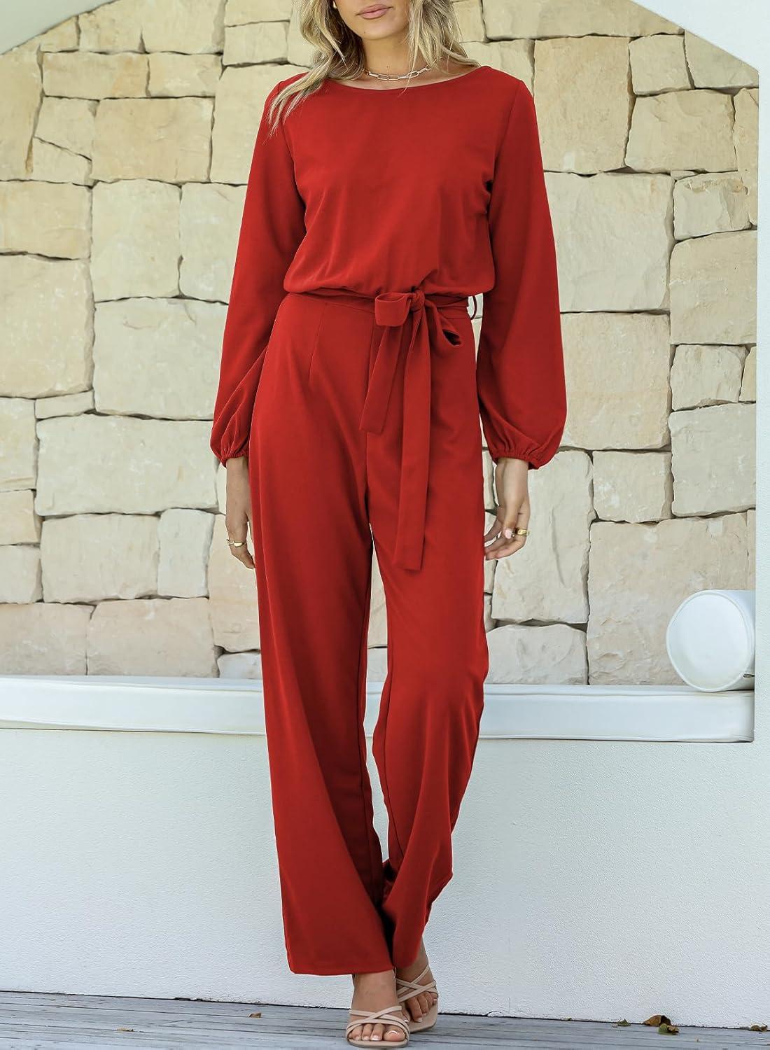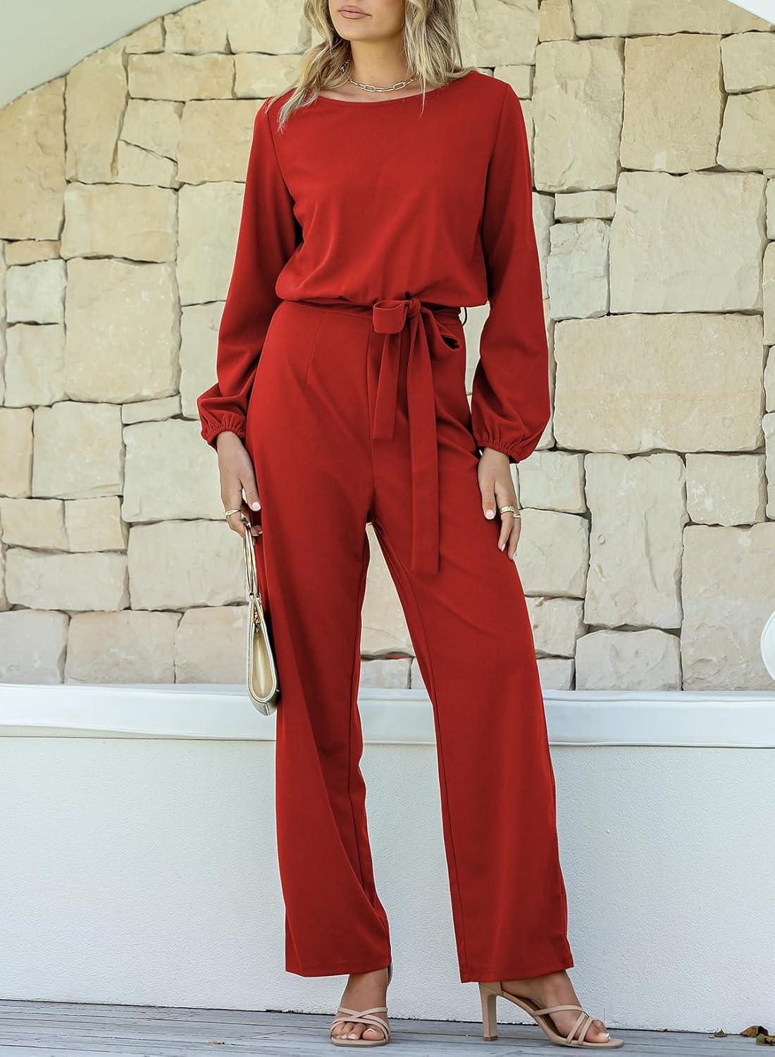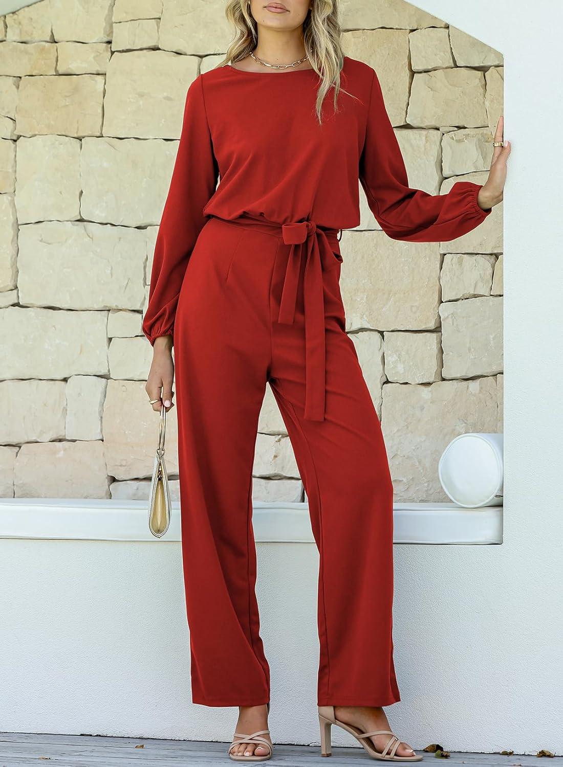 Happy Sailed Womens Loose Short Sleeve Belted Wide Leg Pant Romper Jumpsuit Business Casual One Piece Outfits(Red)