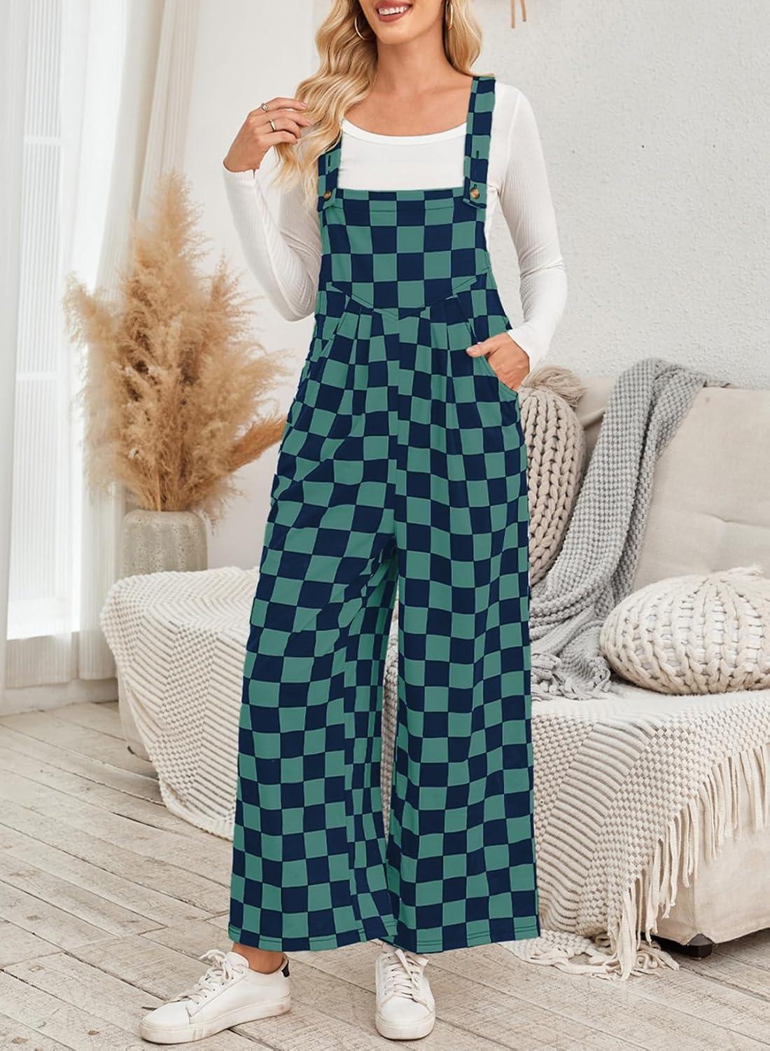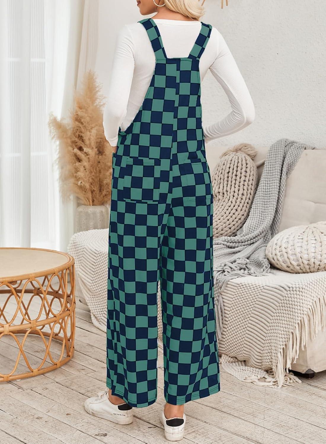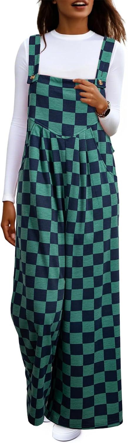 Happy Sailed Womens Plaid Overalls Casual Loose Sleeveless Adjustable Straps Wide Leg Pants Jumpsuit with Pockets(Green)