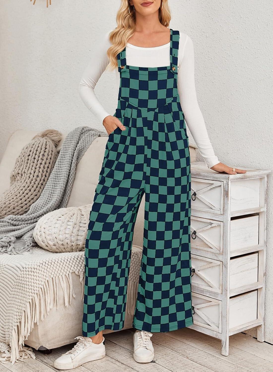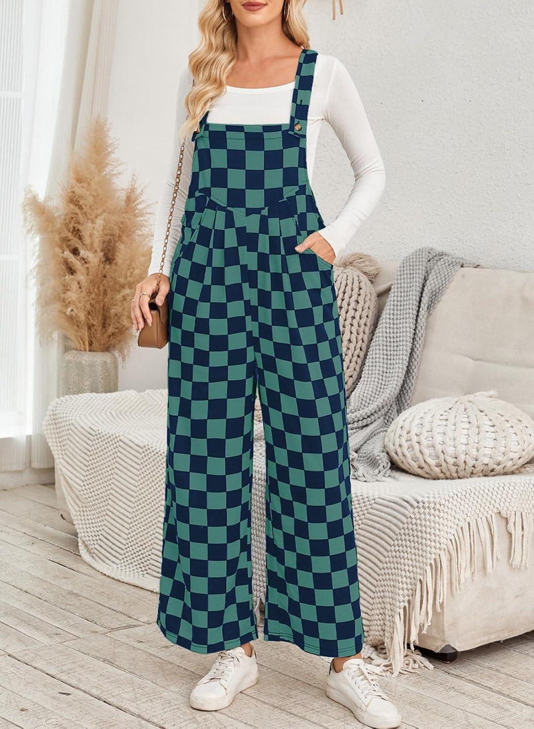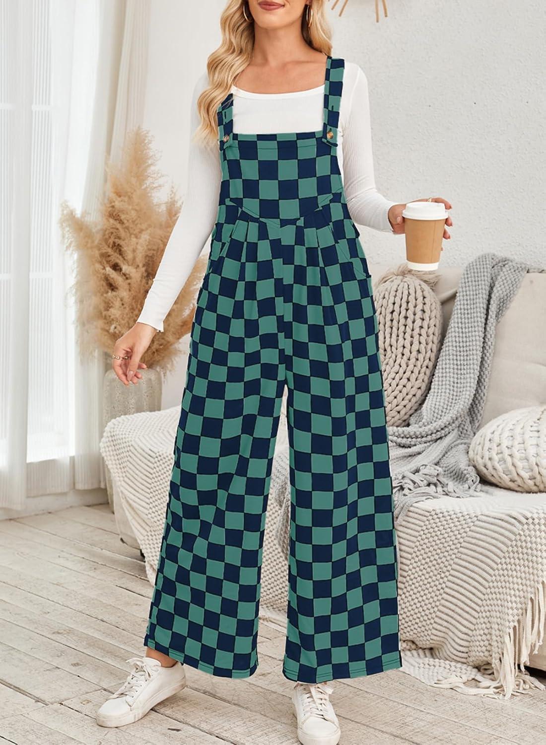 Happy Sailed Womens Plaid Overalls Casual Loose Sleeveless Adjustable Straps Wide Leg Pants Jumpsuit with Pockets(Green)