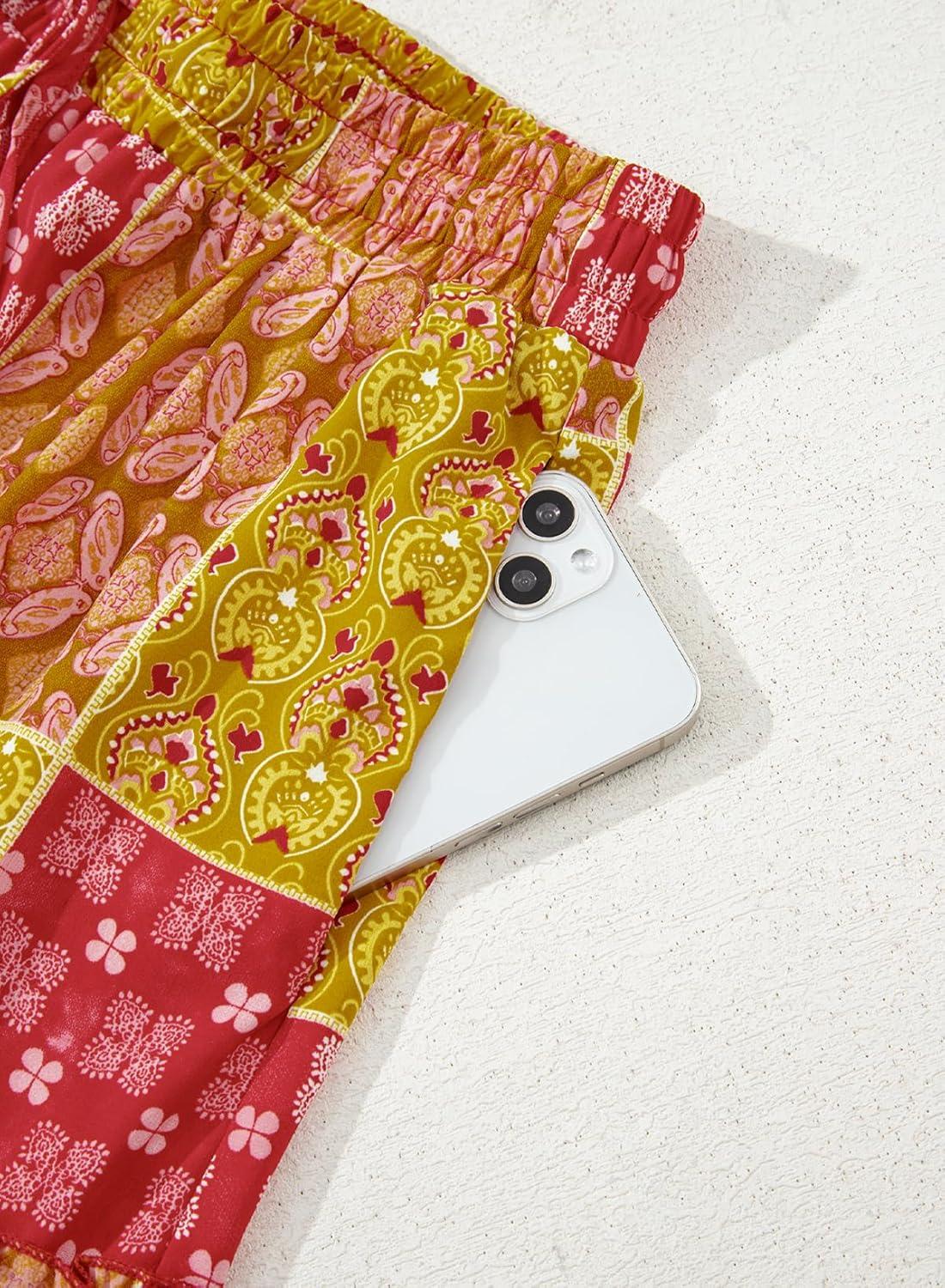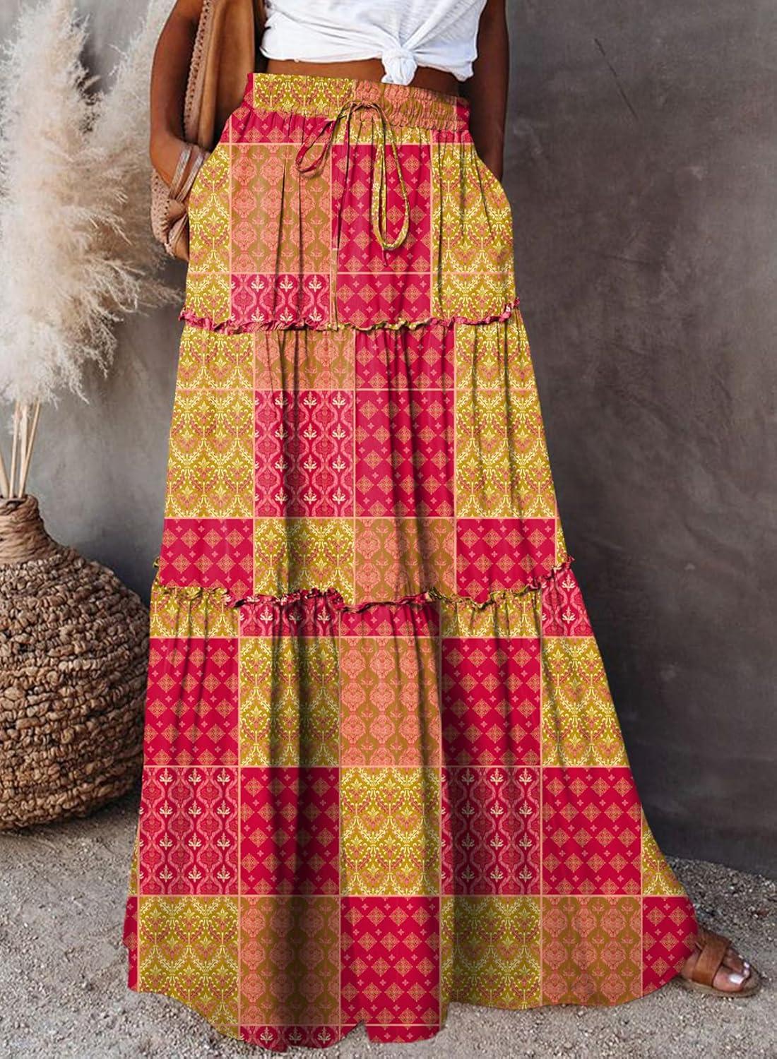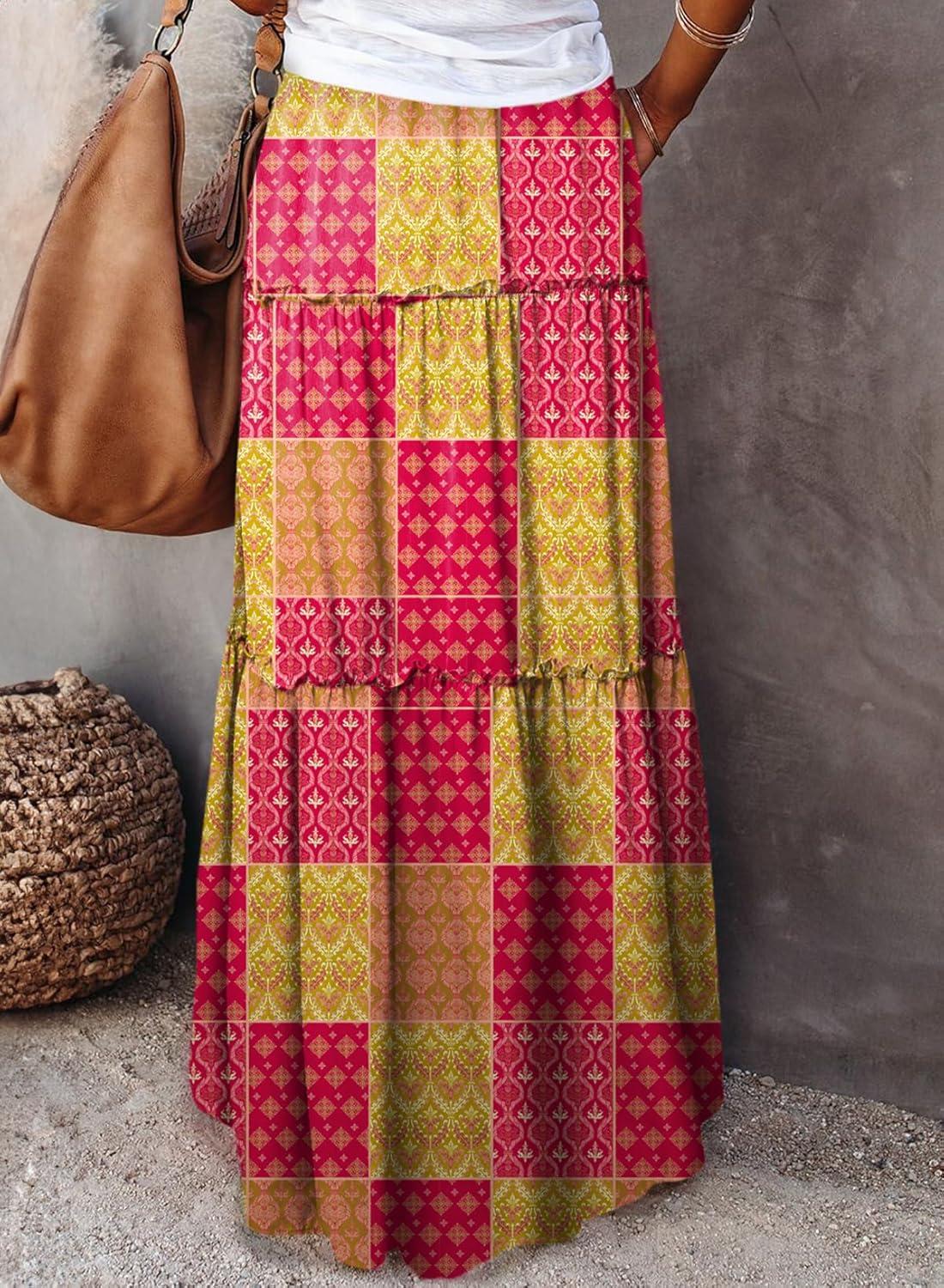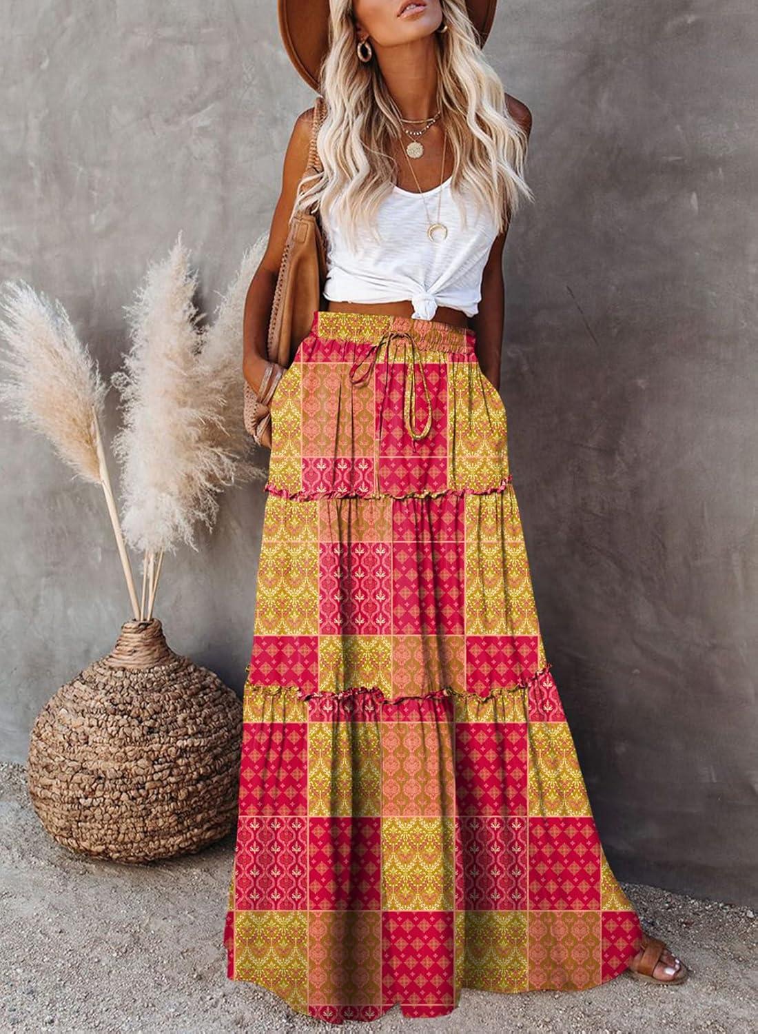 Happy Sailed Womens Retro Boho Printed High Waist Elastic Waist A Line Flowy Long Maxi Beach Skirts with Pockets Orange Small