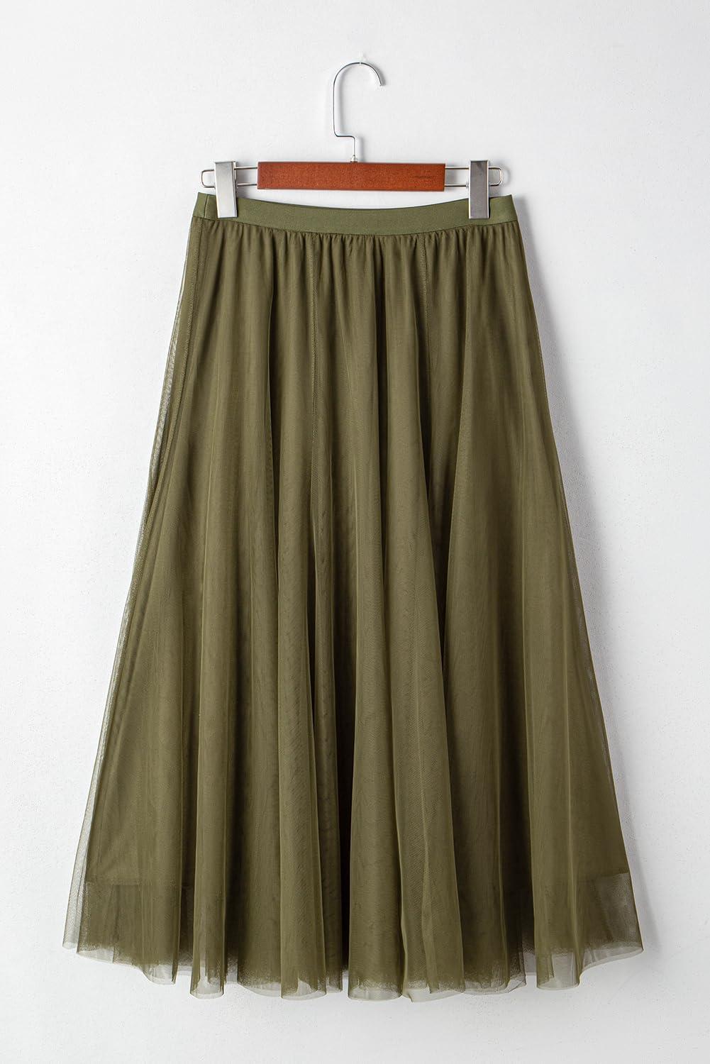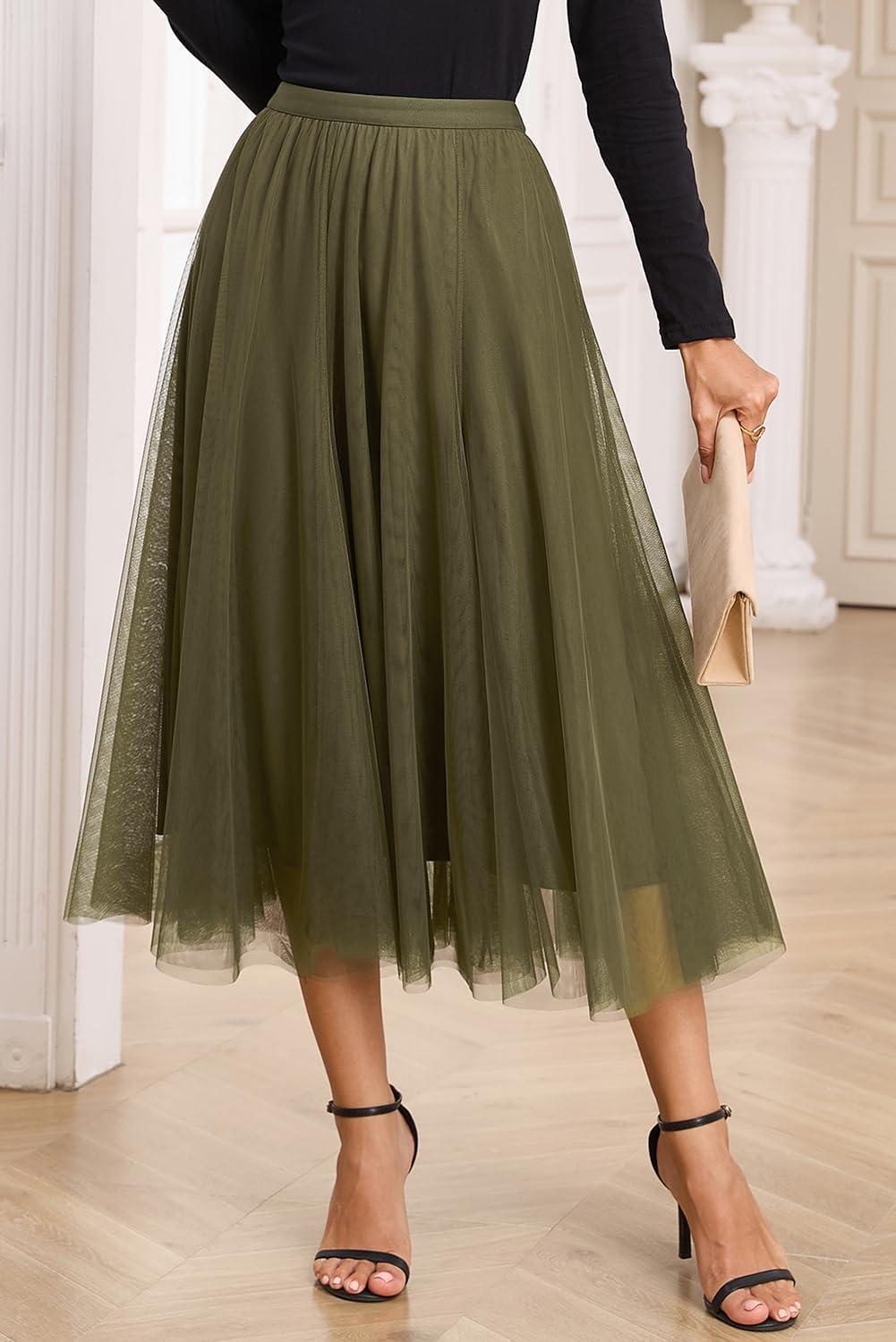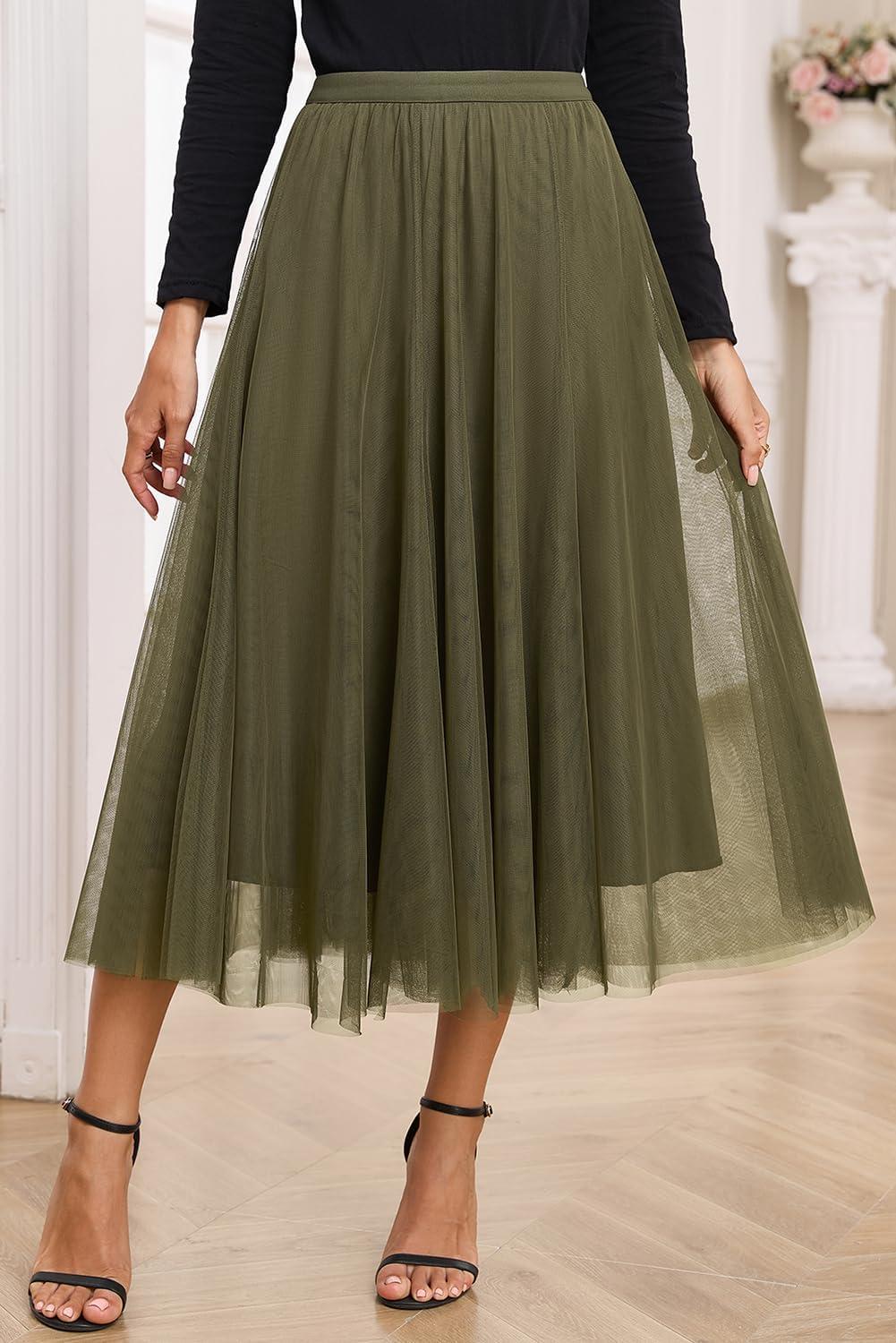 Happy Sailed Womens Tulle Skirt Fall Fashion Elastic High Waisted A-Line Layered Flowy Long Tutu Skirts Date Night Outfits(Green)
