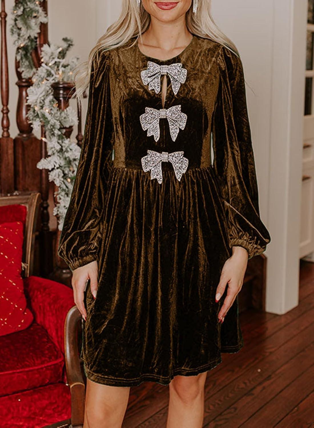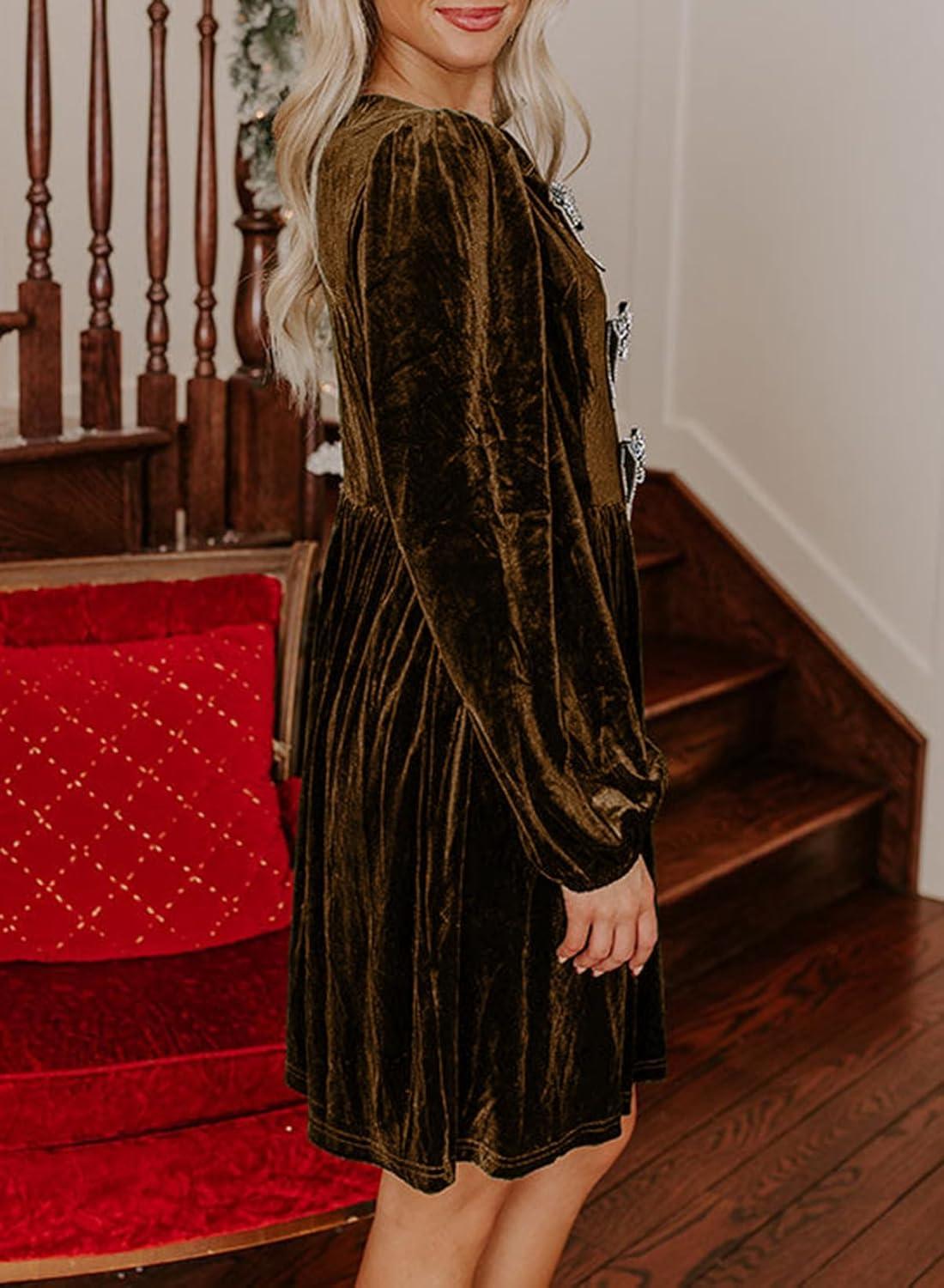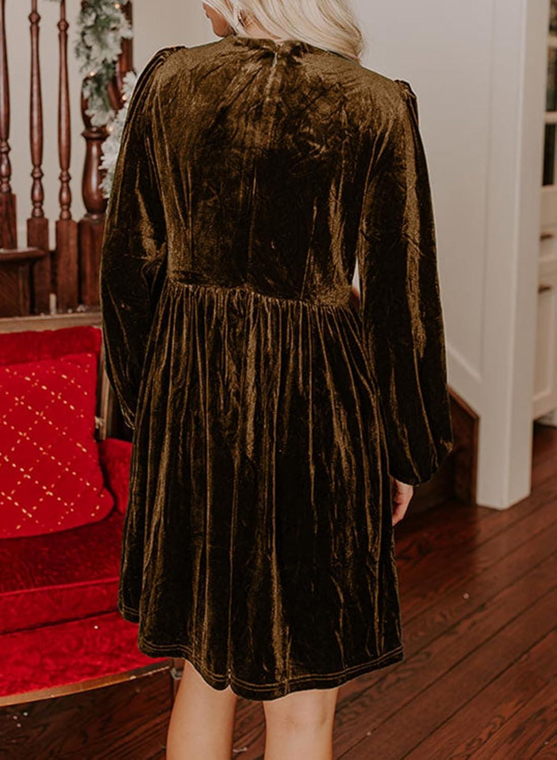 Happy Sailed Women’s Velvet Dress Fall Fashion Lantern Long Sleeve Front Bowknot High Waist A Line Cocktail Party Dress(Coffee)