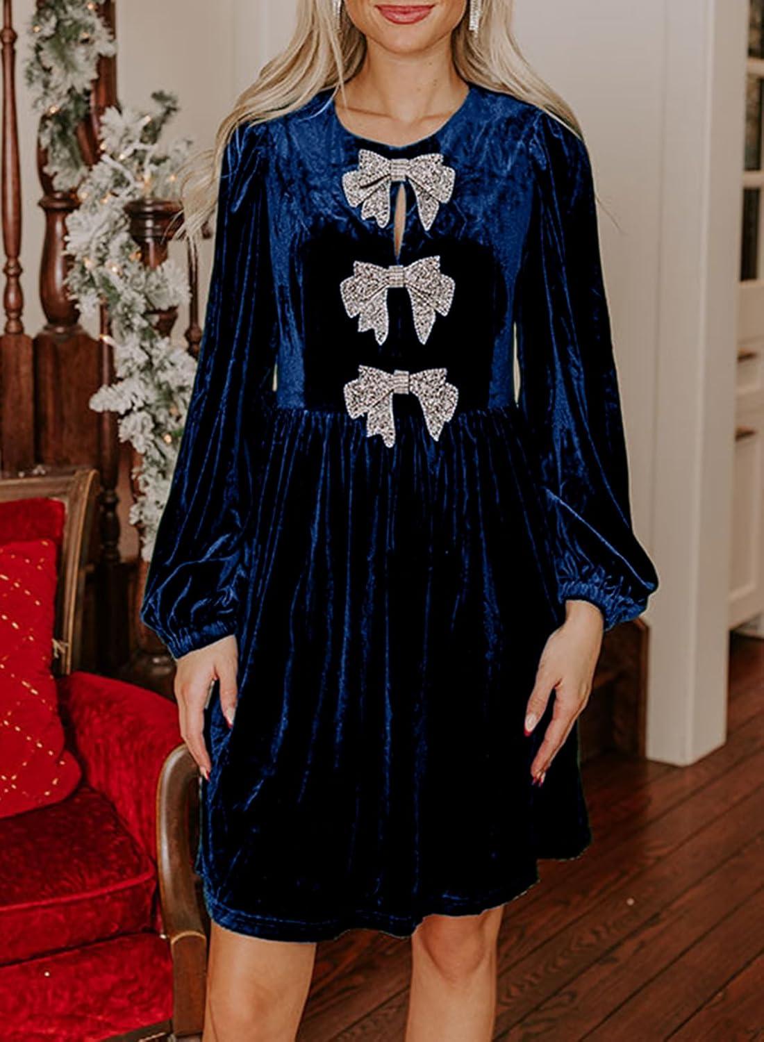 Get up to 50% off on Happy Sailed Women’s Velvet Dress Fall Fashion Lantern Long Sleeve Front Bowknot High Waist A Line Cocktail Party Dress(Navy Blue) styles during our spring sale event.