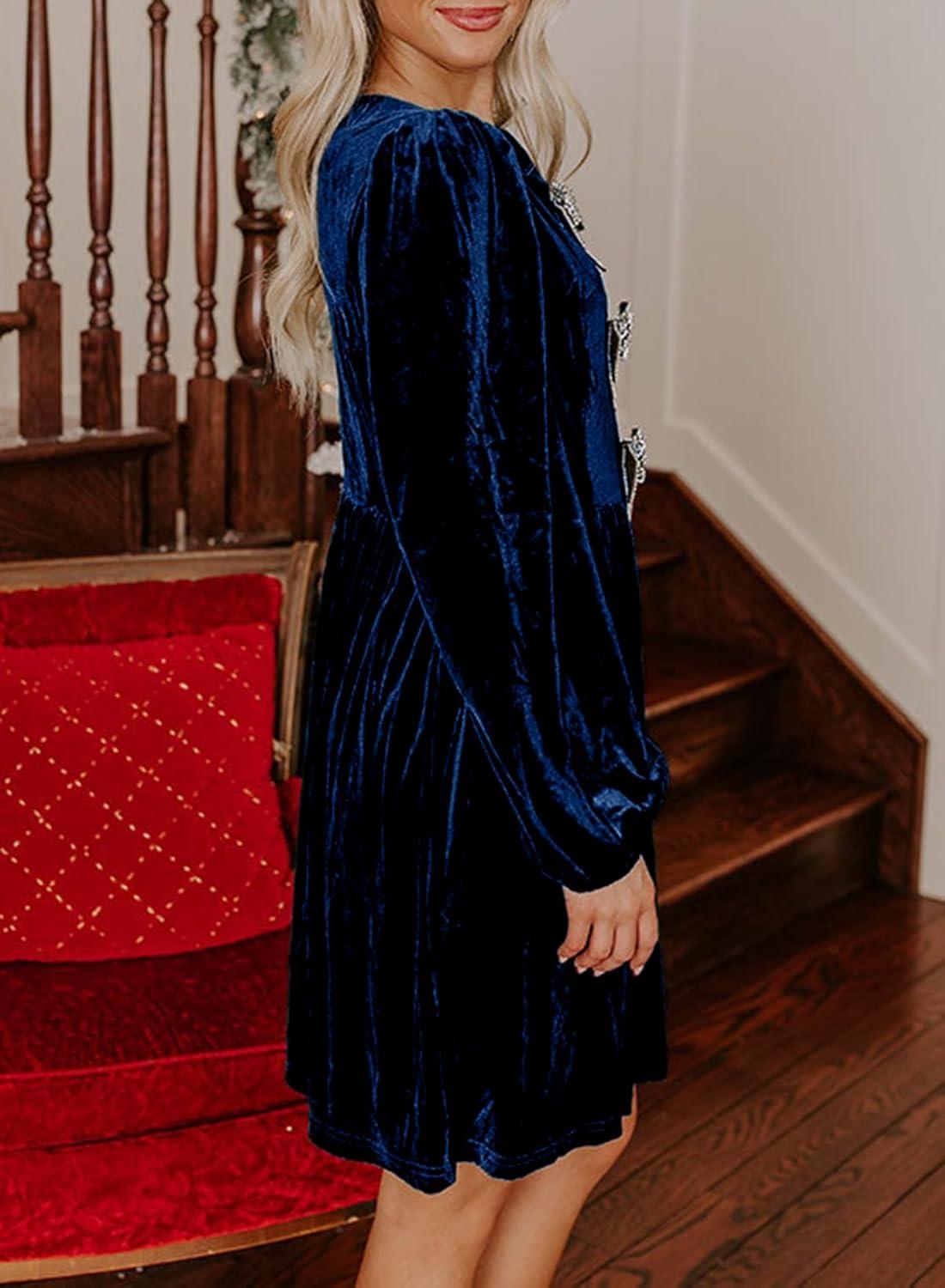 Happy Sailed Women’s Velvet Dress Fall Fashion Lantern Long Sleeve Front Bowknot High Waist A Line Cocktail Party Dress(Navy Blue)