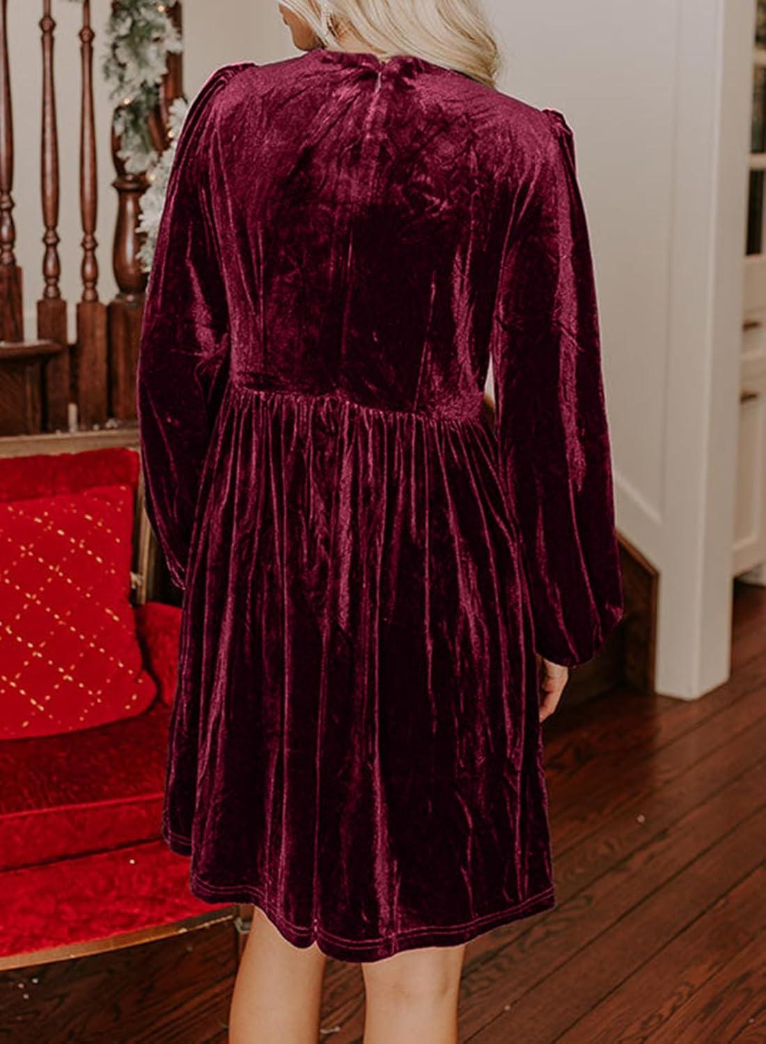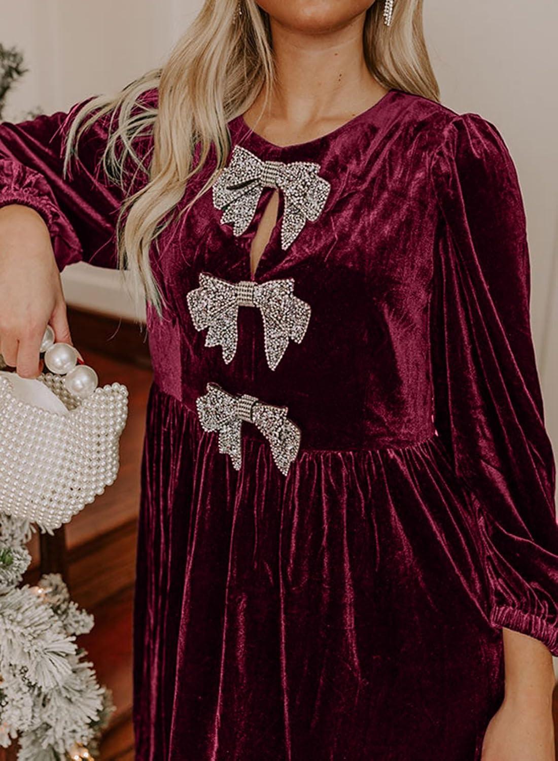 Happy Sailed Women’s Velvet Dress Fall Fashion Lantern Long Sleeve Front Bowknot High Waist A Line Cocktail Party Mini Dress(Burgundy)