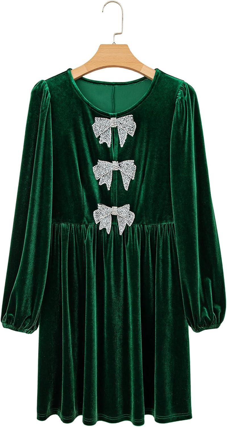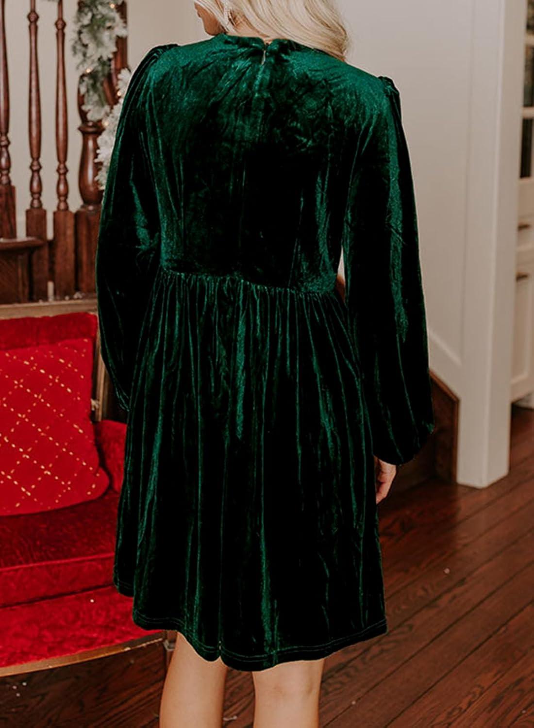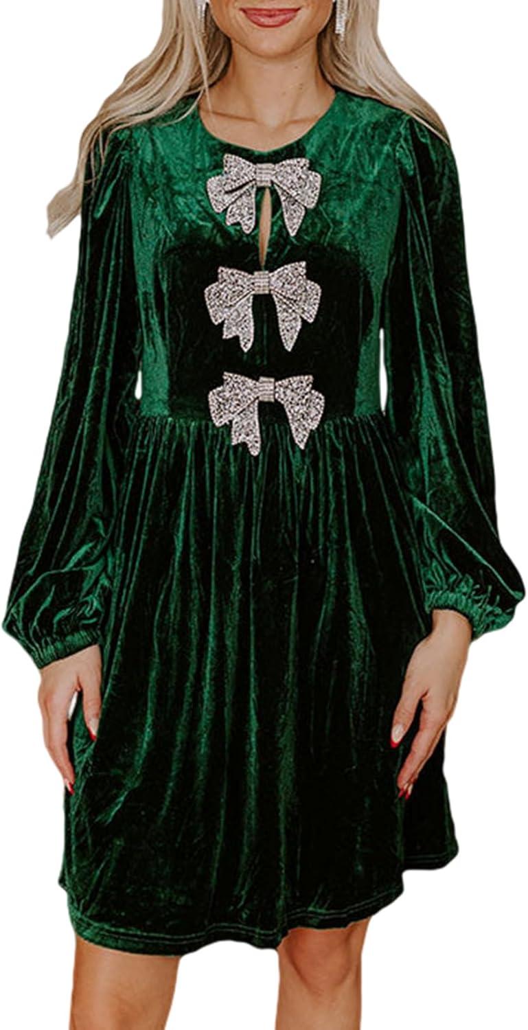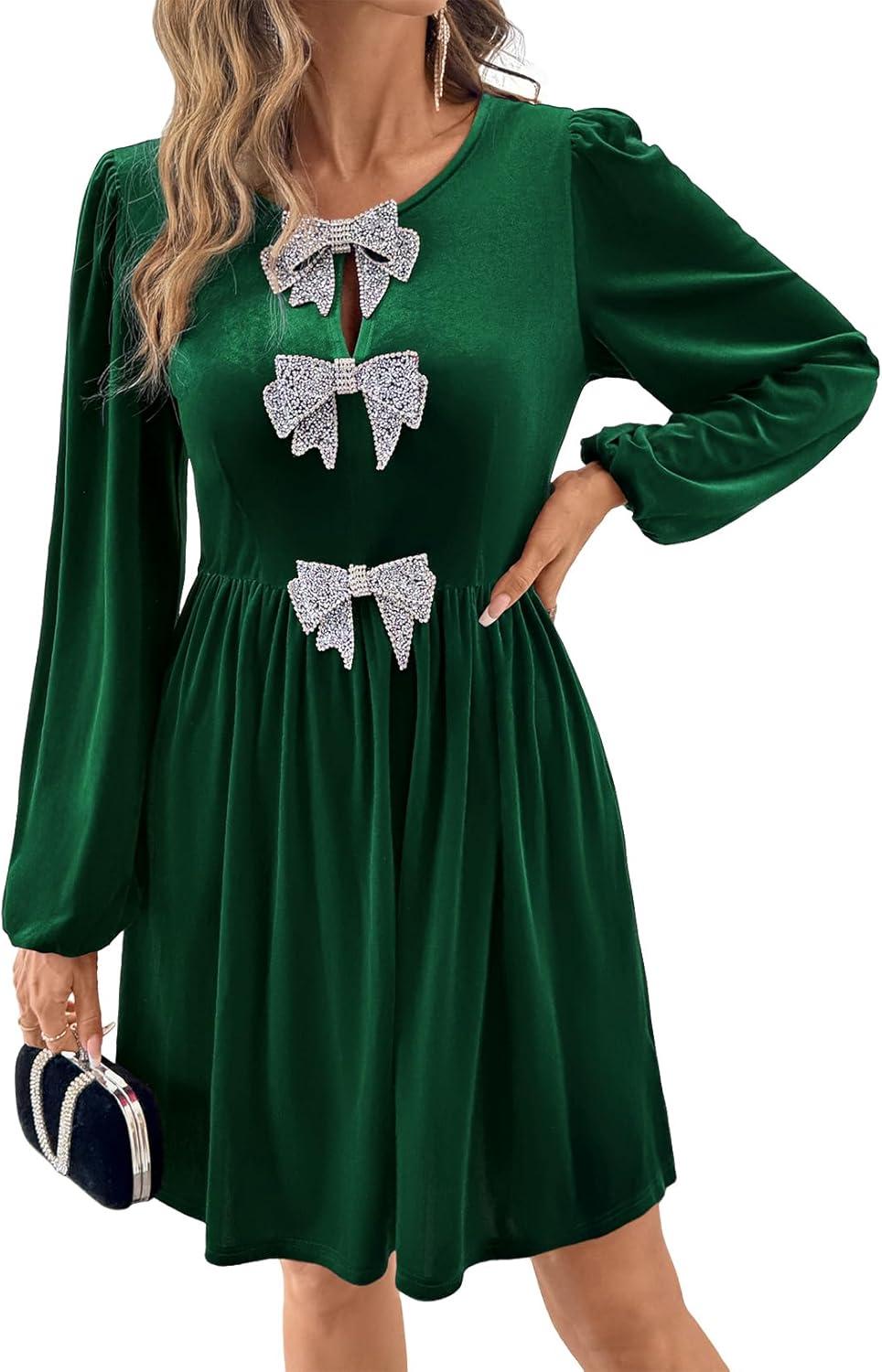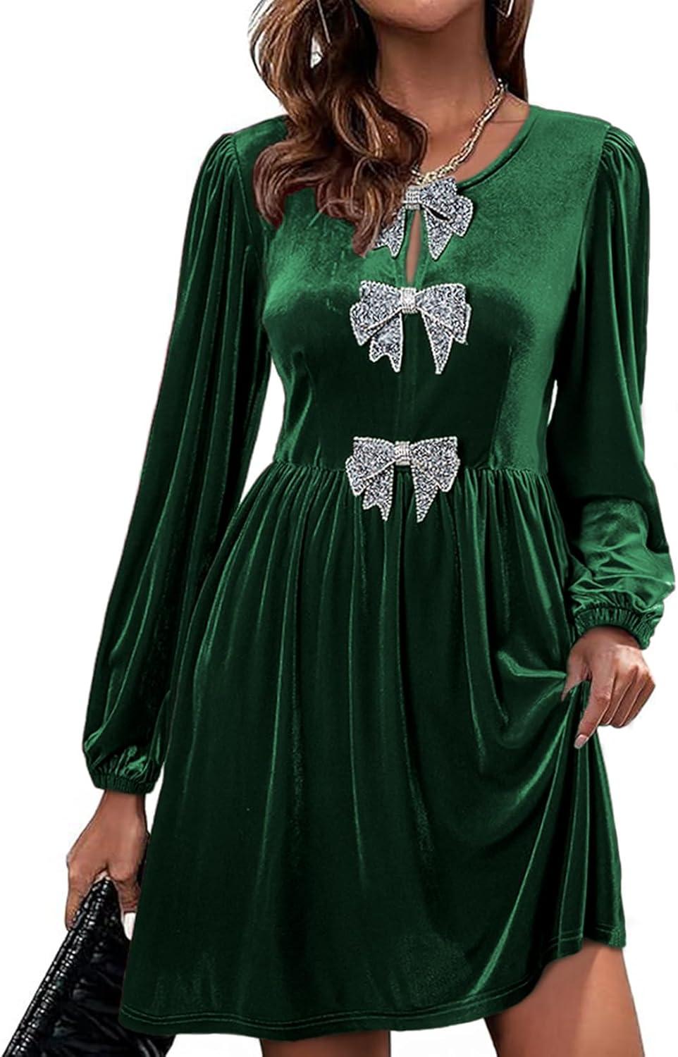 Happy Sailed Womens Velvet Dress Fall Winter Long Sleeve Front Bowknot High Waisted A Line Cocktail Dresses for Wedding Guest(Dark Green)