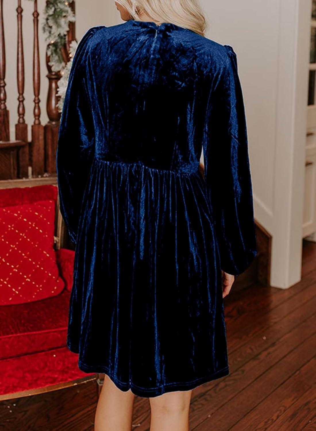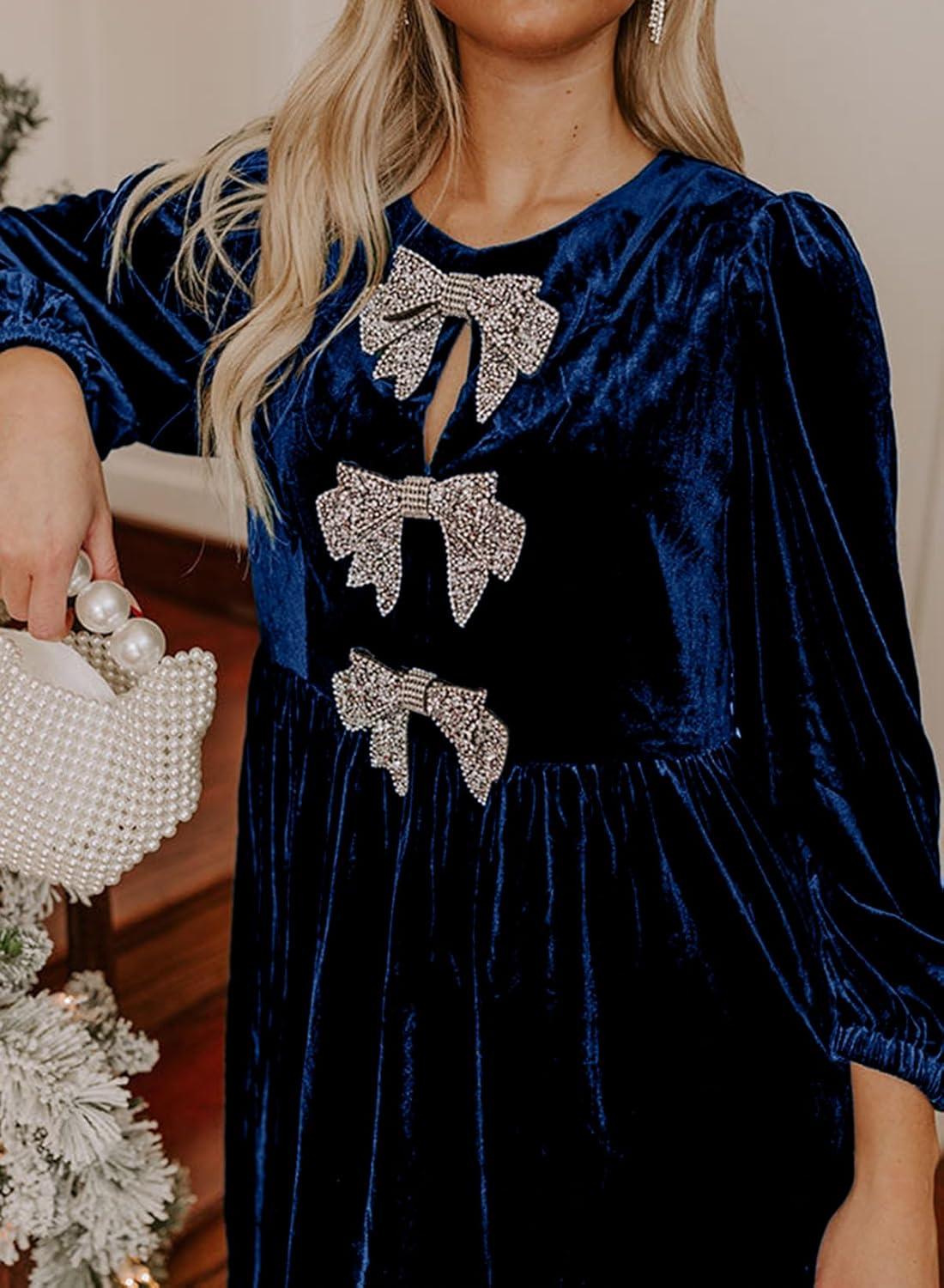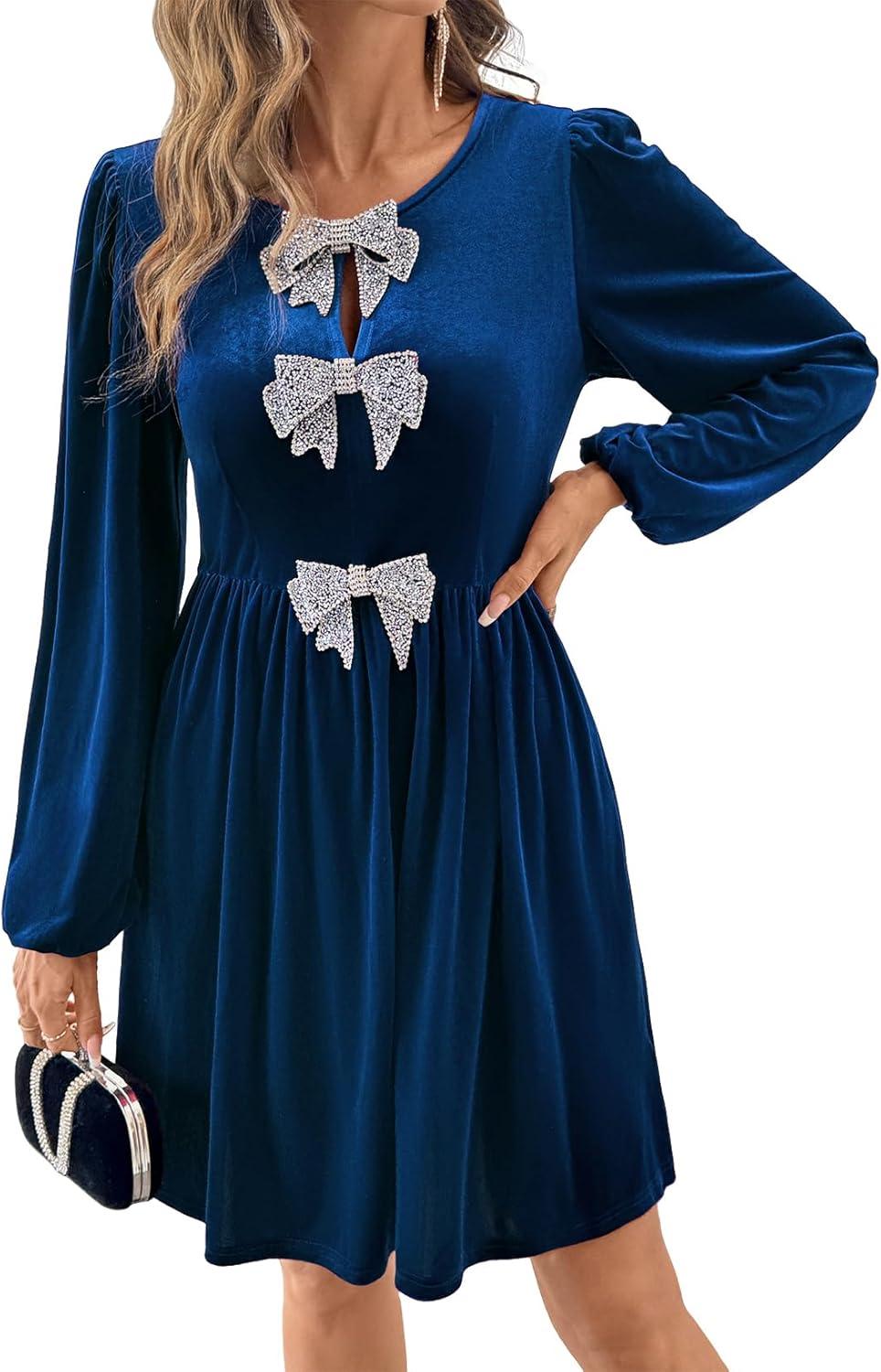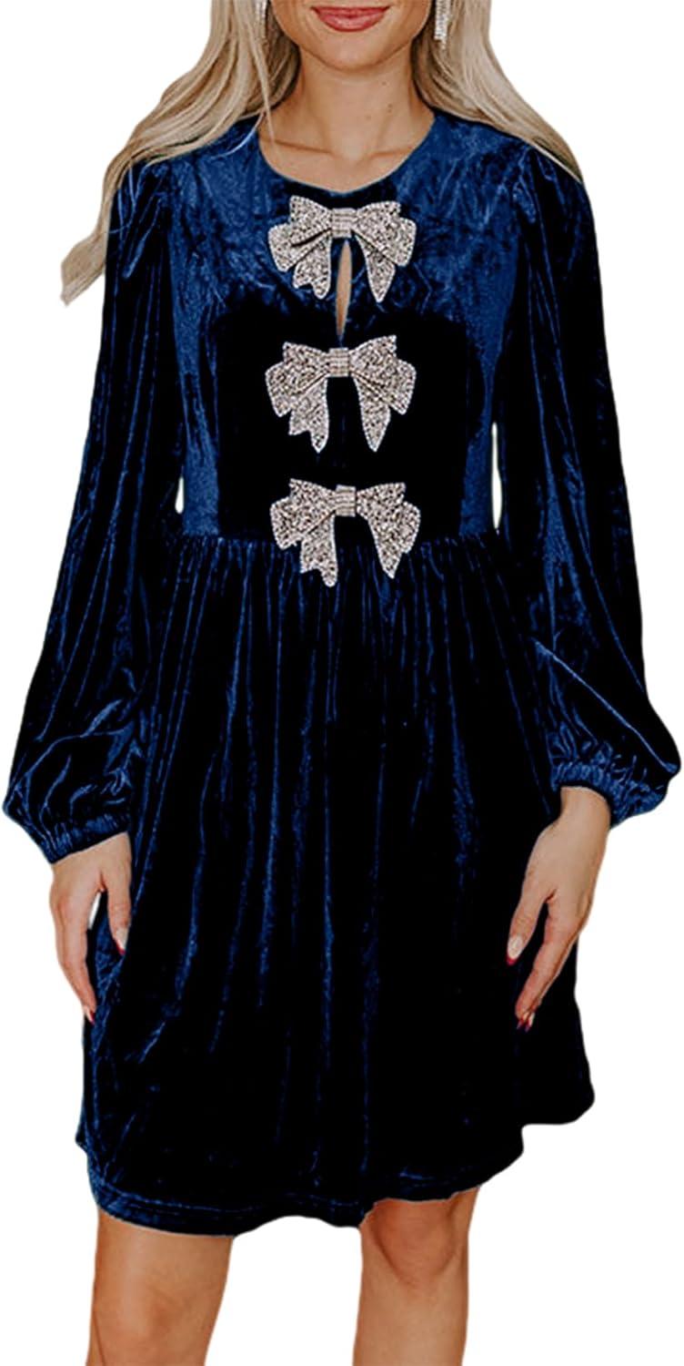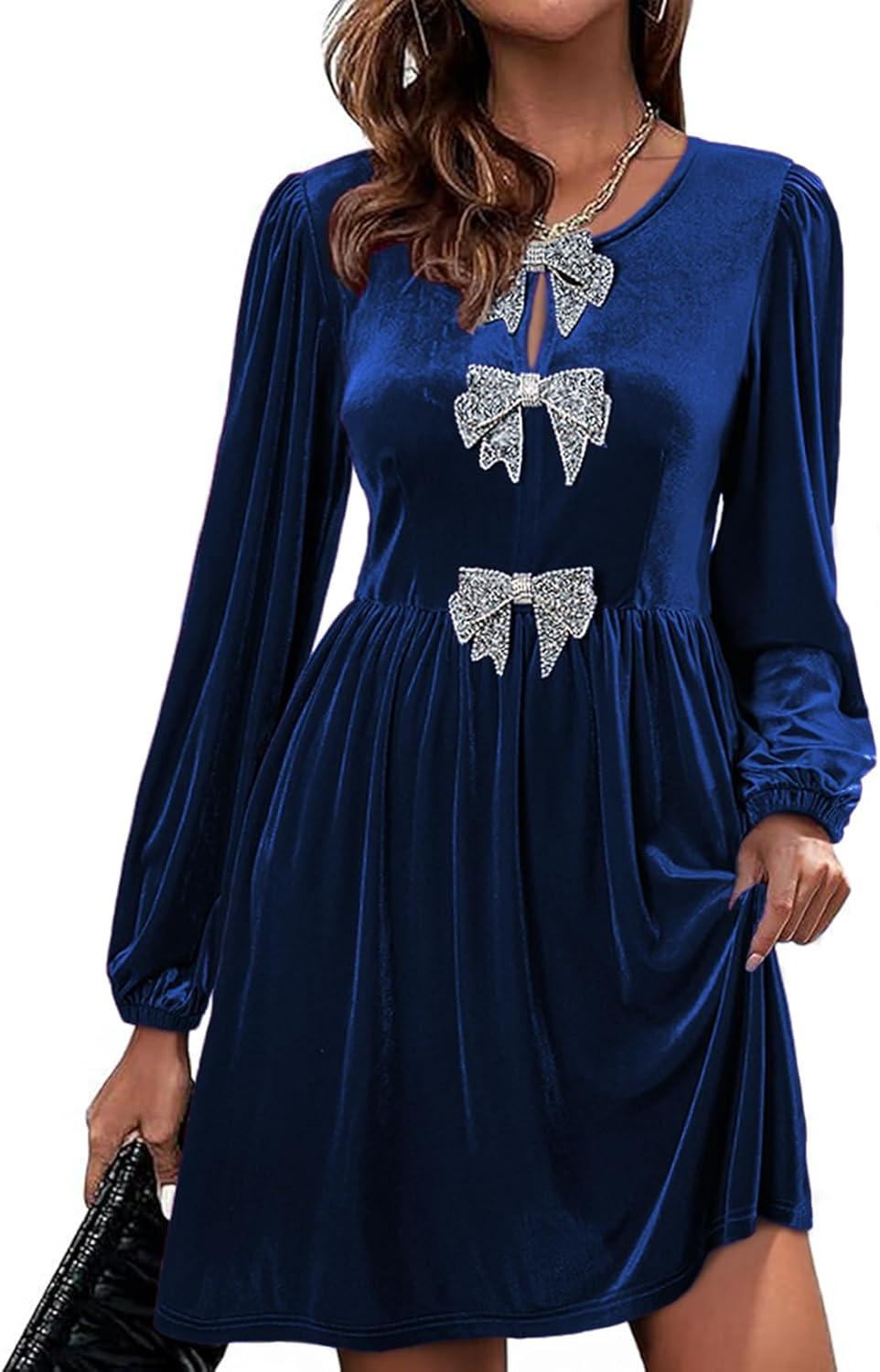 Happy Sailed Womens Velvet Dress Fall Winter Long Sleeve Front Bowknot High Waisted A Line Cocktail Dresses for Wedding Guest