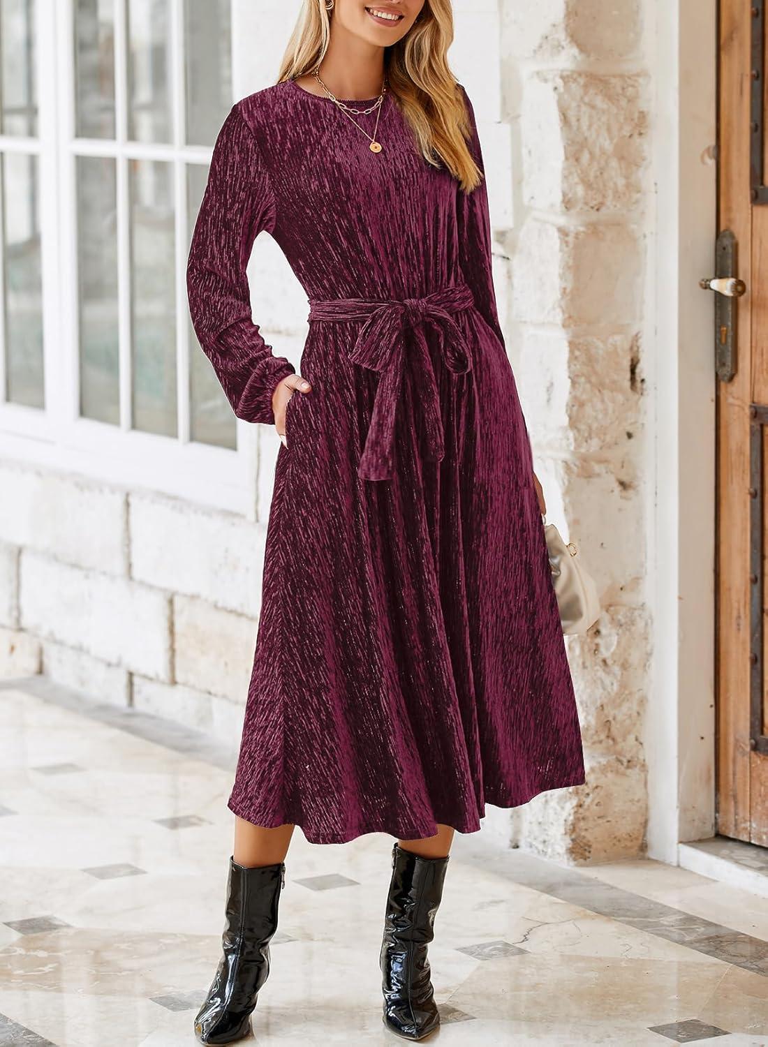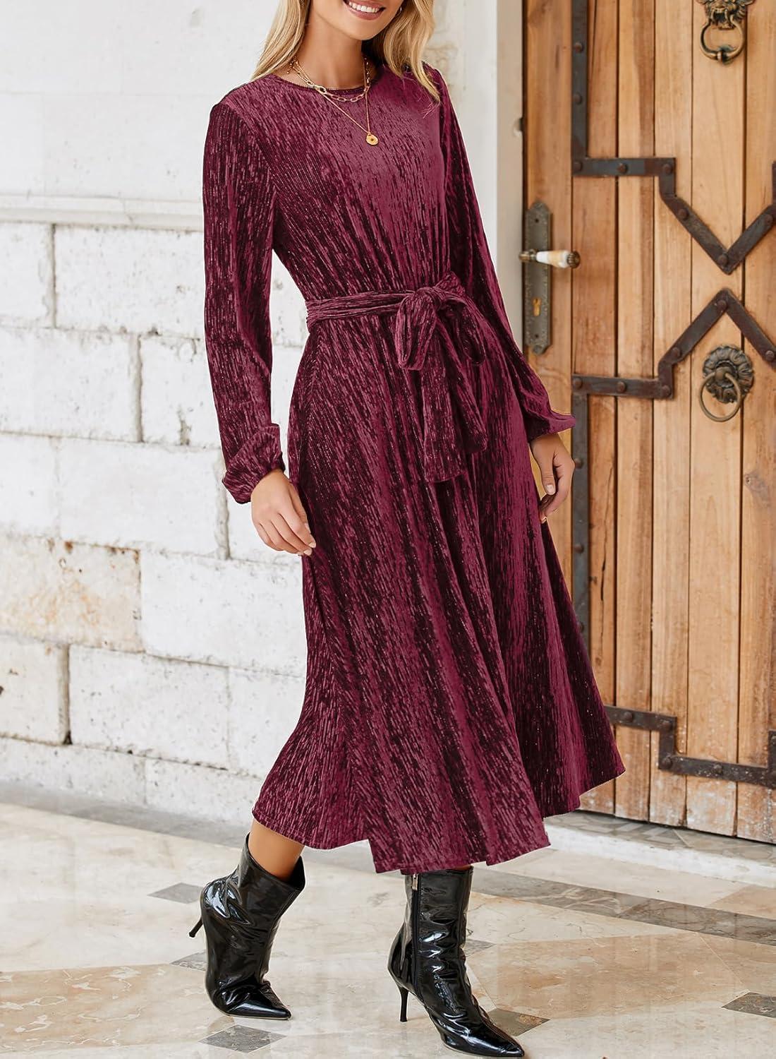 Happy Sailed Women’s Velvet Dress Fashion Fall Winter Long Sleeve High Waist A-Line Semi Formal Wedding Guest Dresses(Burgundy)