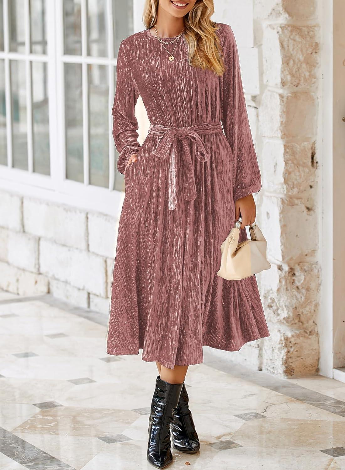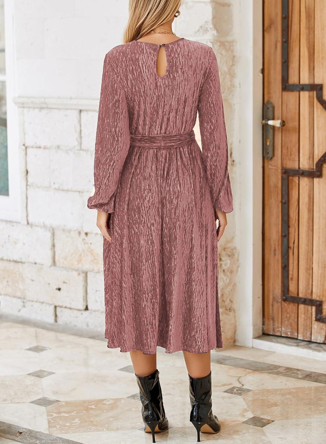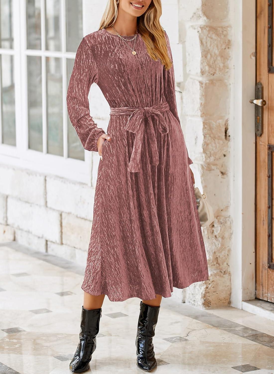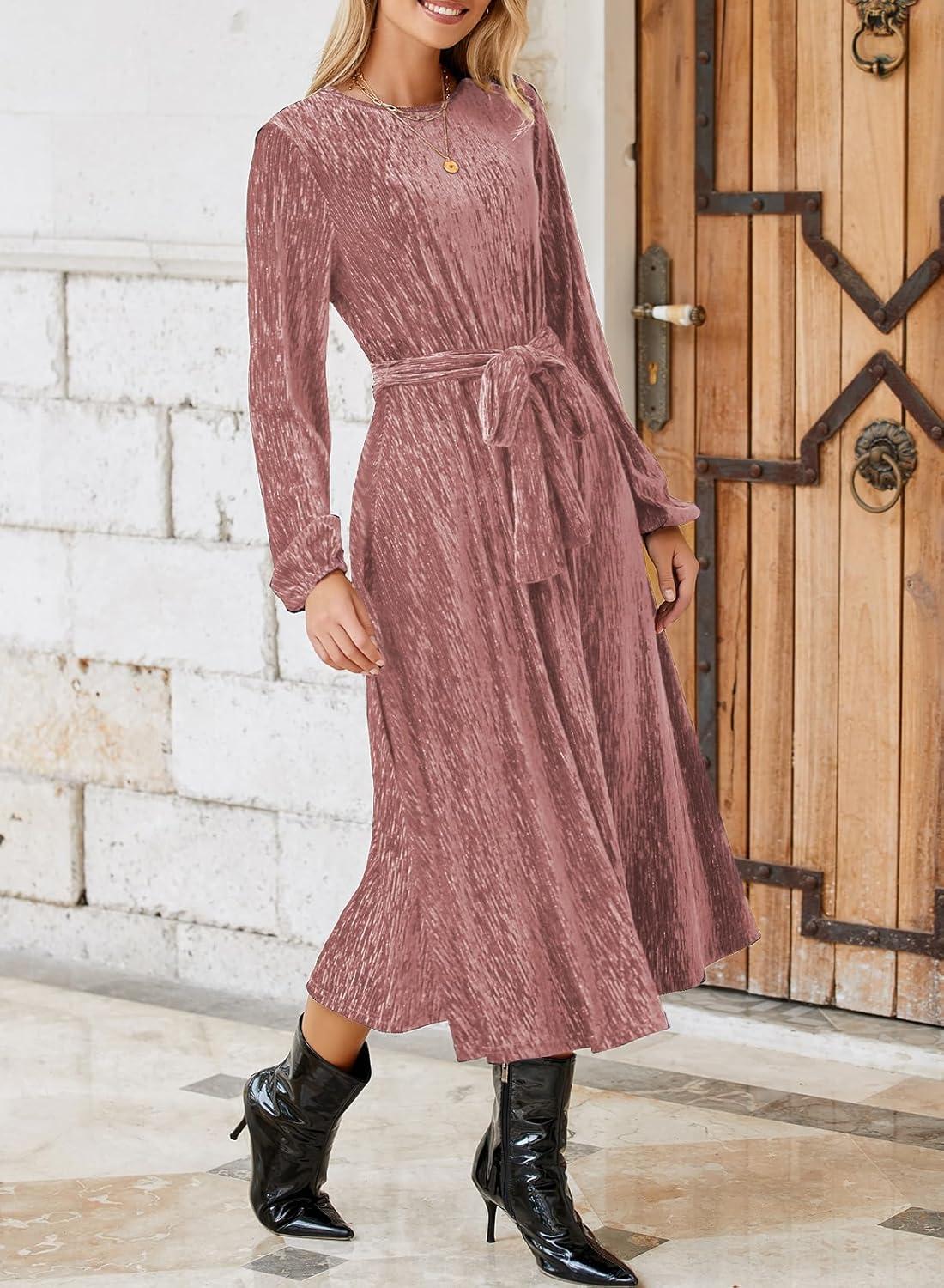 Happy Sailed Women’s Velvet Dress Fashion Fall Winter Long Sleeve High Waist A-Line Semi Formal Wedding Guest Dresses(Pink)
